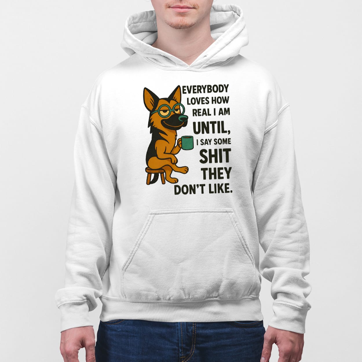 Wearing it isn’t just about humor; it’s a quiet statement against fake approval. The cartoon Shepherd sipping coffee echoes modern realism — calm, grounded, and unshaken by noise. A piece that speaks volumes about being real in a world that too often prefers pretense.
