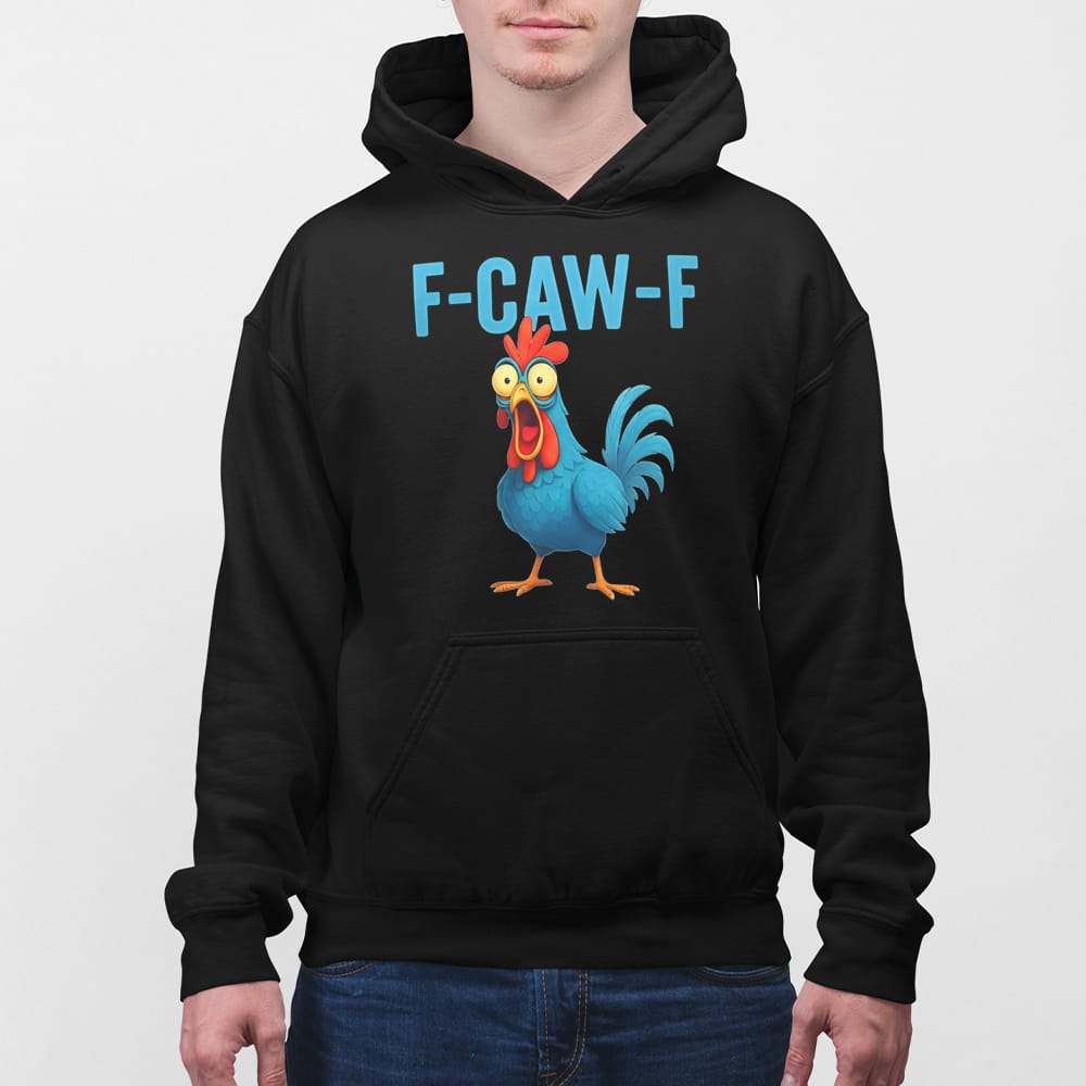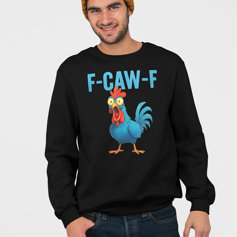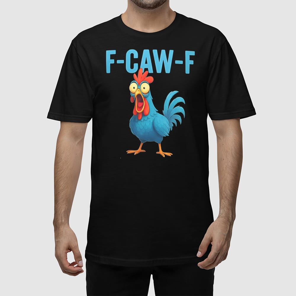 This shirt highlights a wide-eyed blue rooster in full cry, paired with the quirky phrase “F-Caw-F.” Roosters have long been symbols of vigilance and awakening, reminding communities across history to rise against challenges while poking fun at life’s daily absurdities.