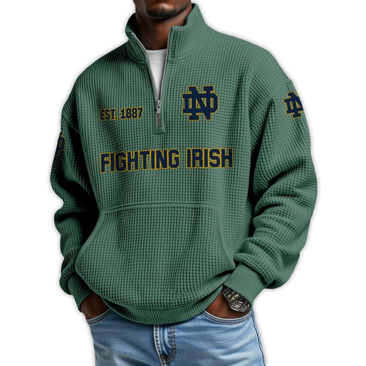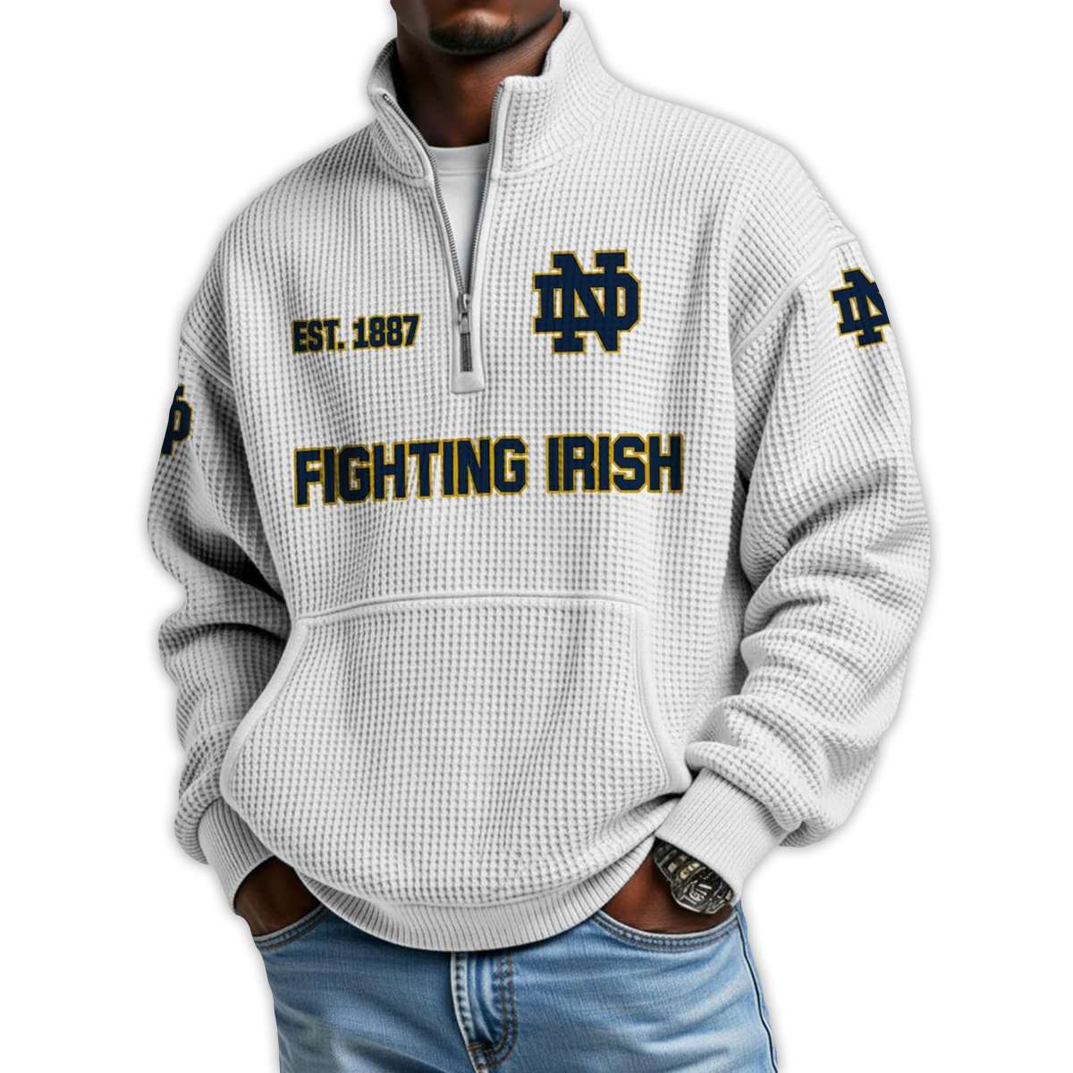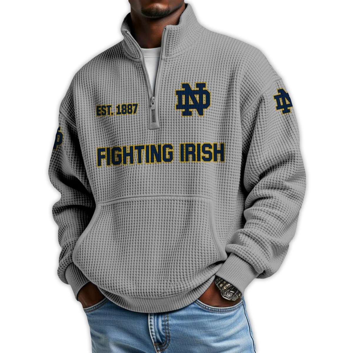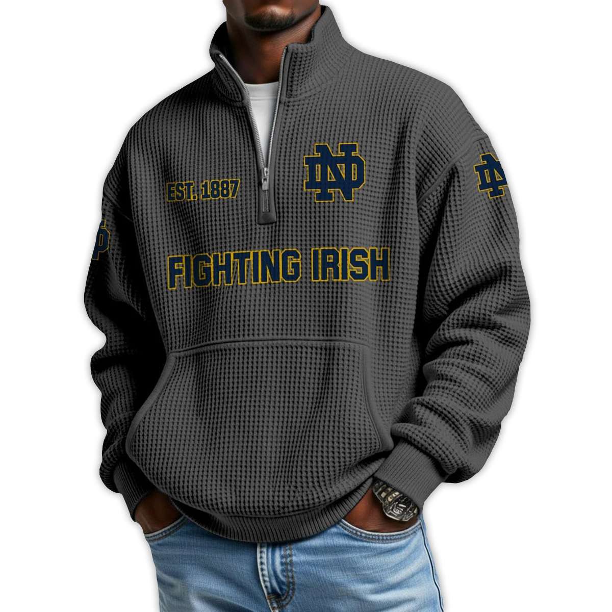 Honor a legacy of grit with the Fighting Irish Football Est 1887 Waffle Stand Collar Half Zip Sweatshirt. Featuring bold graphics and historic emblems, this pullover connects fans to Notre Dame’s storied football tradition, iconic players, and enduring spirit of perseverance.