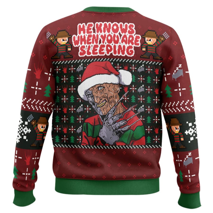 For horror enthusiasts and collectors, this piece reflects decades of film history. Freddy’s impact on cinema and popular culture has made him one of the most recognizable villains worldwide, and this sweater embodies that legacy with humor, nostalgia, and frightful charm.