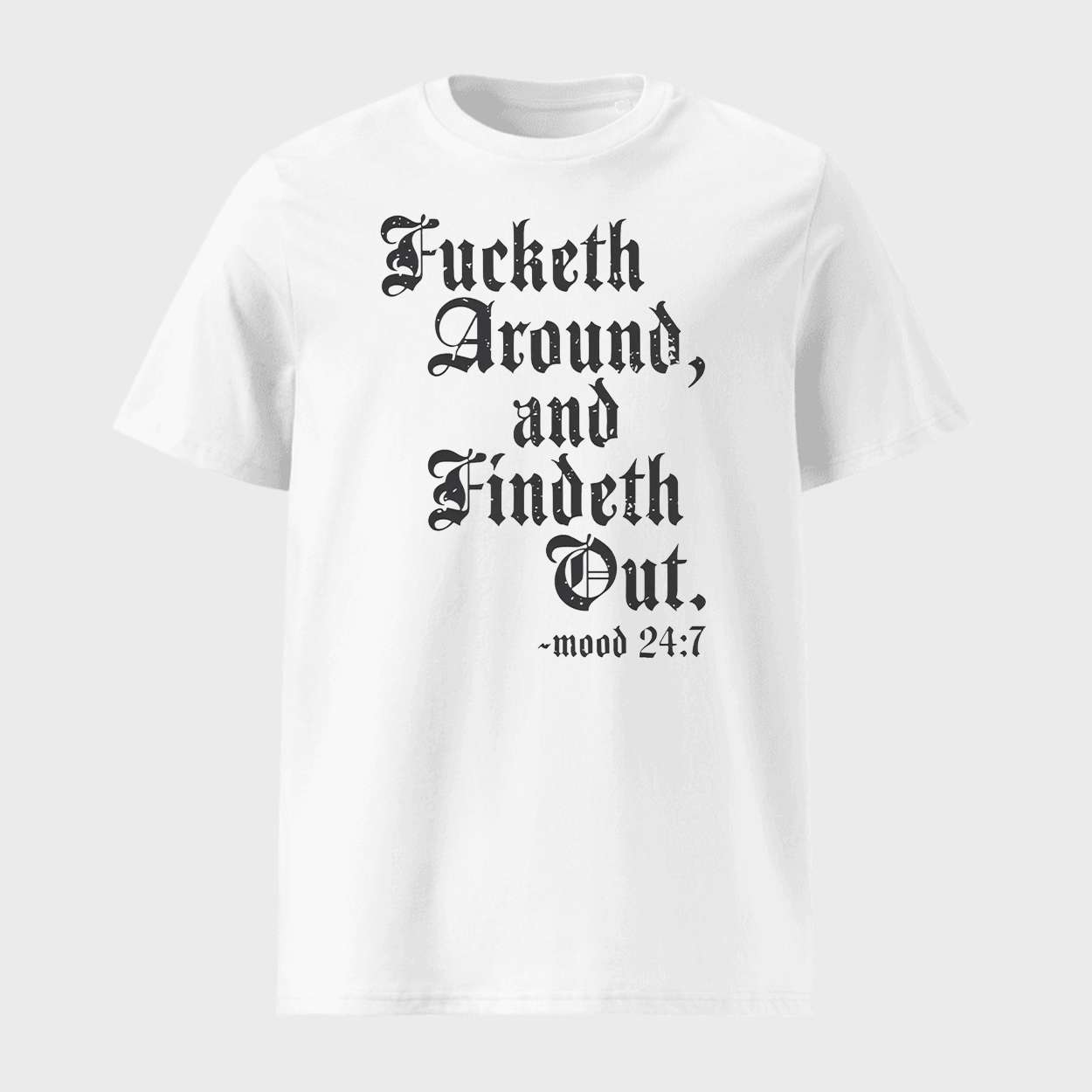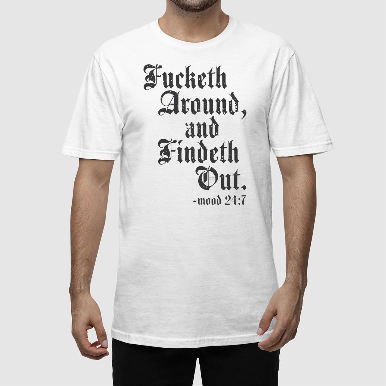 This shirt reimagines a modern phrase with medieval flair, quoting “Fucketh Around, and Findeth Out” as if from sacred text. The Gothic lettering and “Mood 24:7” citation parody biblical verse, turning everyday defiance into a timeless declaration of consequence.