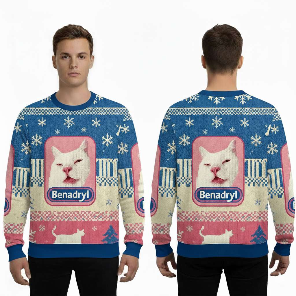 Funny Benadryl Meme Cat Christmas Ugly Sweater – Meme Majesty Meets Holiday Mayhem