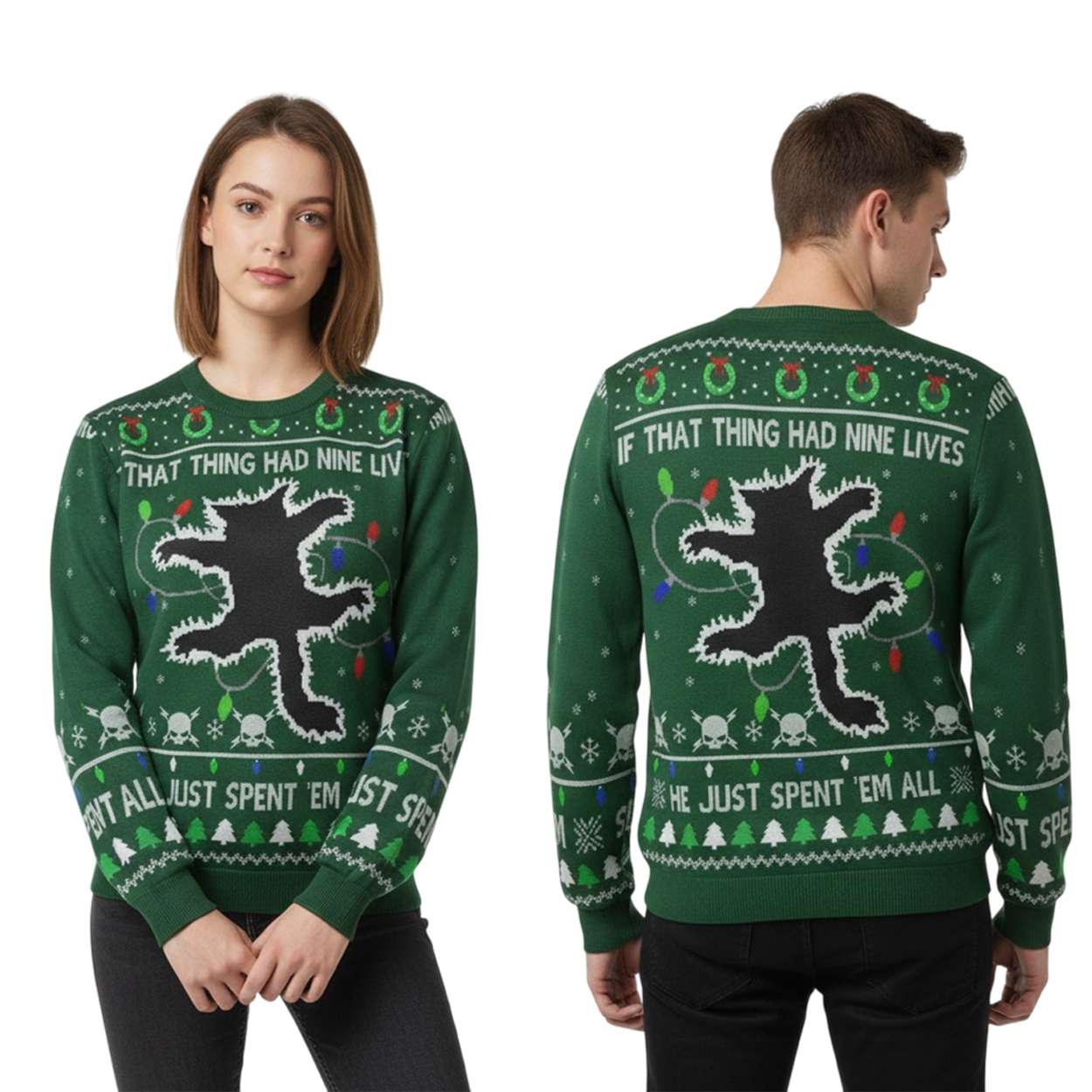 This sweater immortalizes the unforgettable moment from National Lampoon’s Christmas Vacation when Aunt Bethany’s cat chews through the Christmas lights, triggering a literal and figurative meltdown. It’s a tribute to the film’s chaotic charm and its critique of suburban holiday excess.