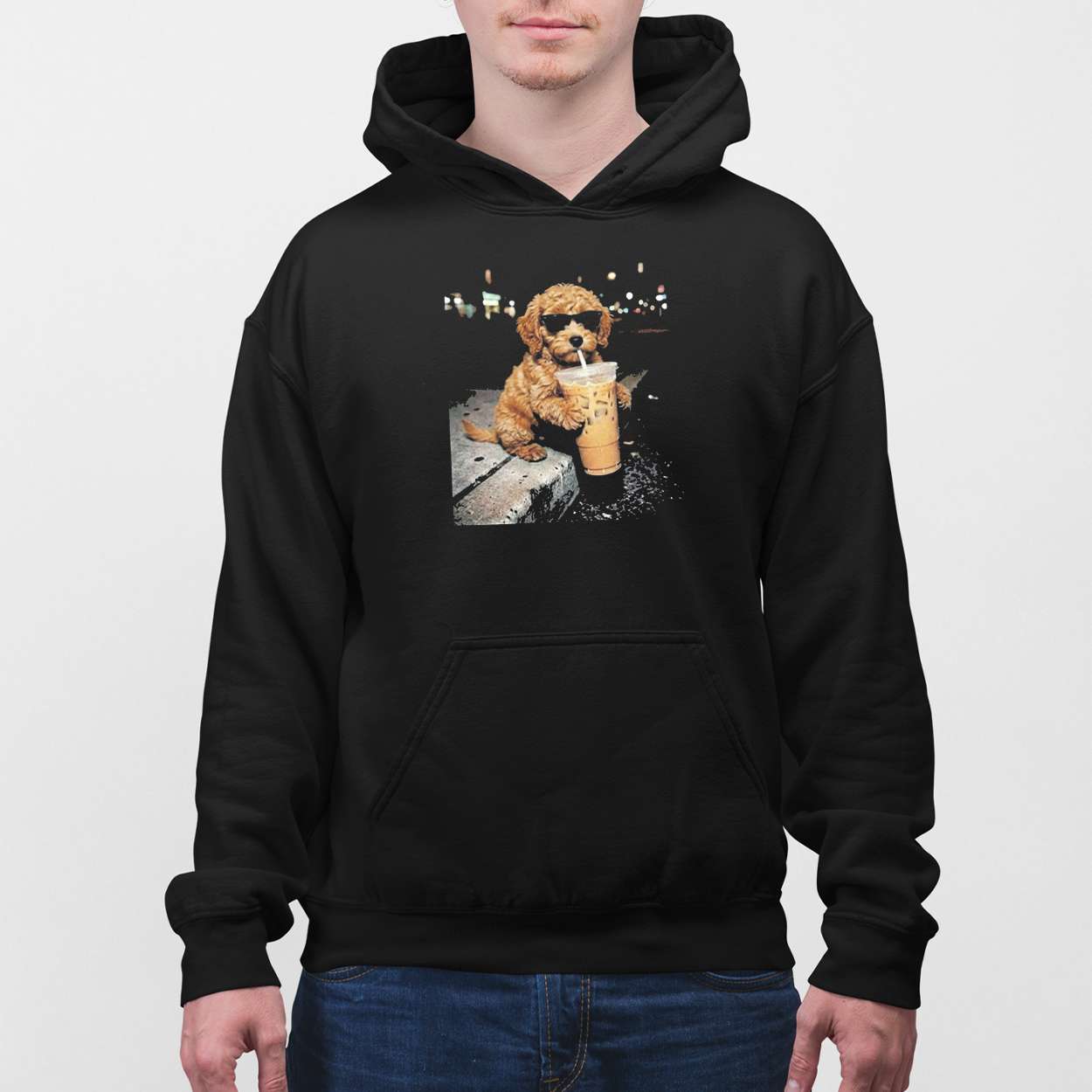 This t-shirt captures a Goldendoodle with sunglasses sipping iced coffee under city lights, embodying the quirky bond between pets and modern lifestyles. It reflects how humor and companionship thrive even in bustling urban nights filled with energy and stories.
