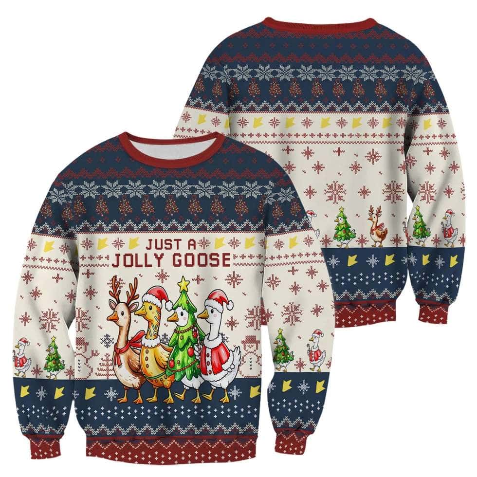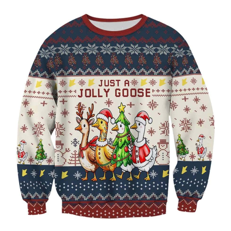 Spread laughter this season with the Funny Just A Jolly Goose Christmas Ugly Sweater. Featuring quirky geese in holiday disguises, this sweater blends humor, tradition, and social commentary into one unforgettable design perfect for festive gatherings and winter fun.