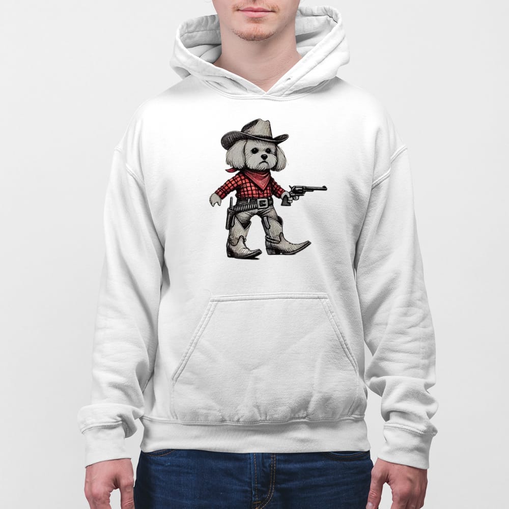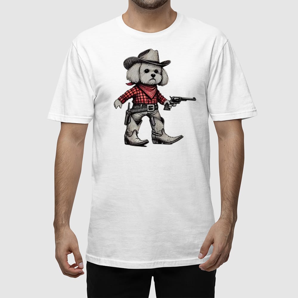 The Funny Maltese Cowboy T-shirt captures the charm of an unlikely hero: a gentle Maltese reimagined as a fearless cowboy. With a red checkered shirt, bandana, boots, and revolver in hand, this character echoes the rugged outlaws and sheriffs who shaped the legends of the American frontier. The playful twist lies in the breed itself—famous for companionship and softness—suddenly cast as a bold figure in the harsh desert towns of history.