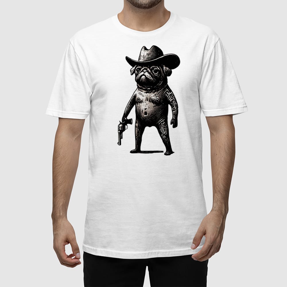 The pug cowboy recalls America’s frontier days when legends of sheriffs and outlaws spread across towns. From dusty saloons to high-noon standoffs, the cowboy figure symbolized resilience, grit, and rebellion. By pairing this iconic imagery with a modern pug, the shirt cleverly reinterprets history with a playful twist, blending tough Western folklore with lighthearted humor.