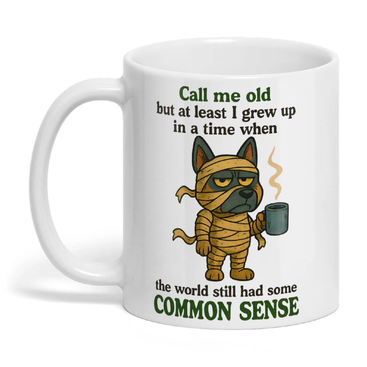 This Halloween mug stars a grumpy German Shepherd dressed like a mummy, clutching coffee as if surviving another day of modern absurdity. His unimpressed stare captures the humor of generations who remember when logic—and mornings—were simpler.