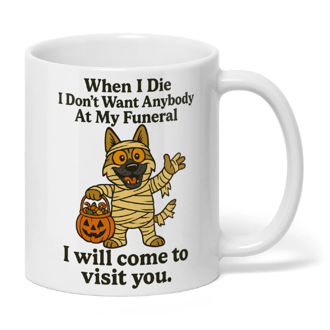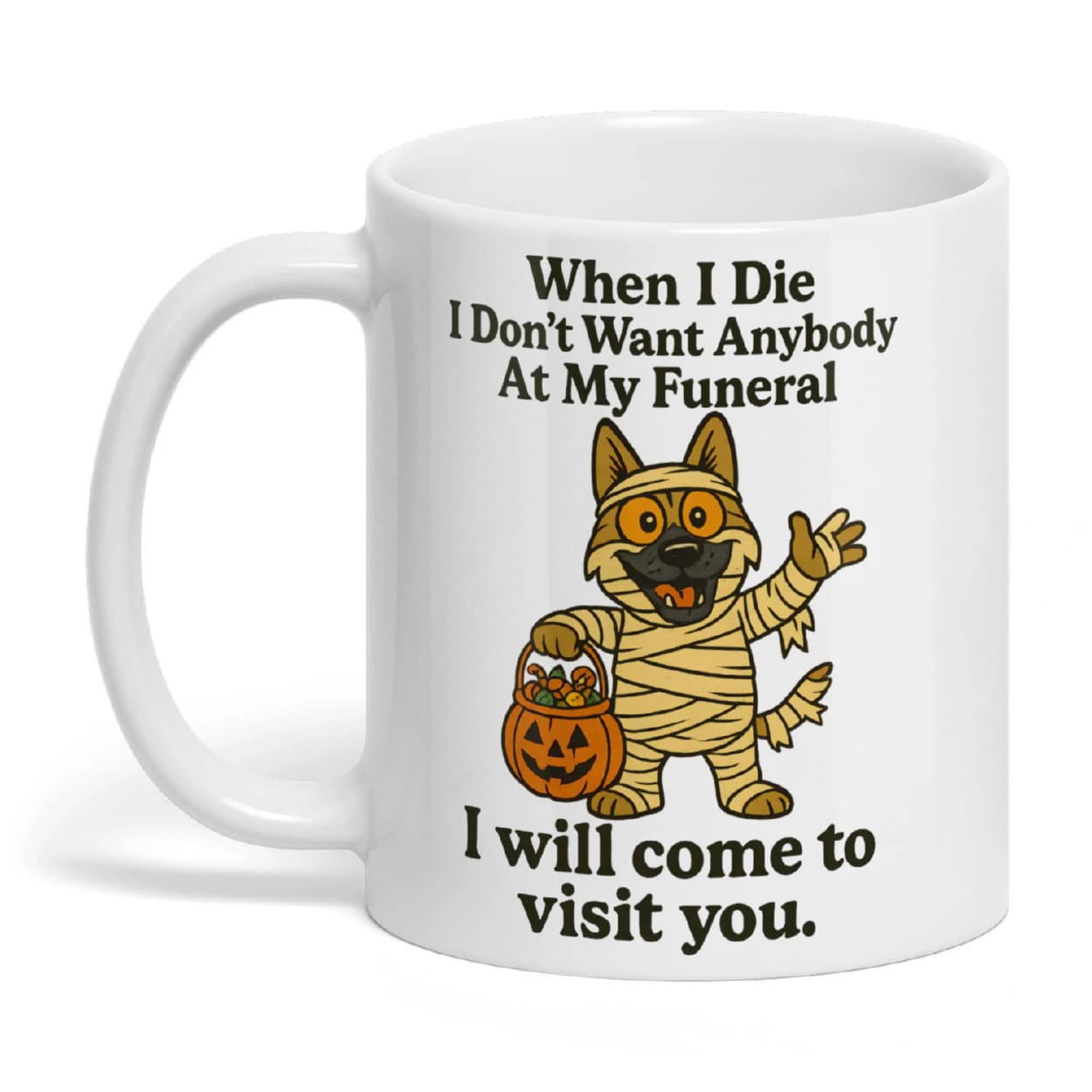 This mug portrays a German Shepherd wrapped like an ancient mummy, humorously declaring eternal devotion even beyond the grave. It reflects the legendary loyalty of dogs, echoing tales from Egyptian burial rituals where canines were believed to guard souls into the afterlife.