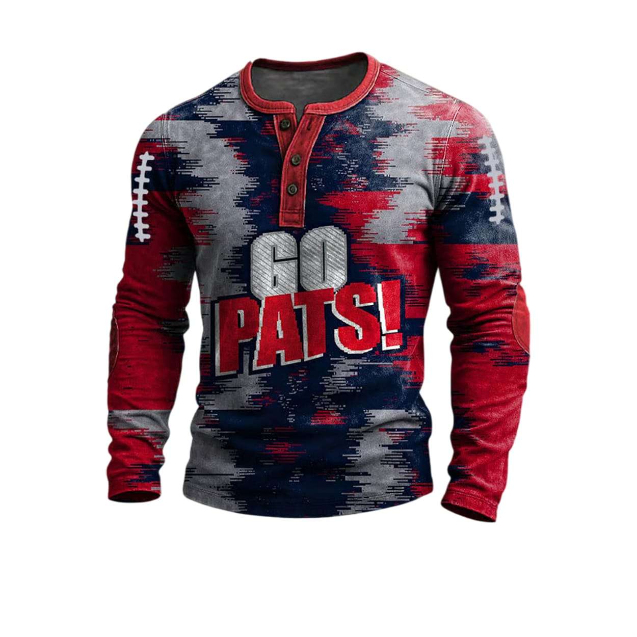 Show your Patriots pride with the Go Pats Football Print Henley Top. Featuring bold graphics, historic nods, and fan-favorite motifs, this shirt connects fashion with football legacy. Perfect for game day or everyday statements that spark conversation.