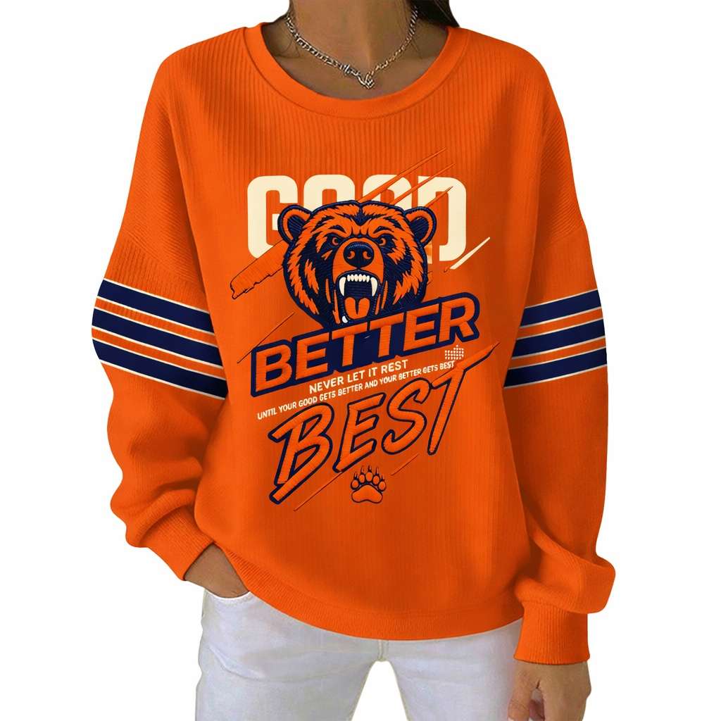 Push past limits with the Good Better Best Print Football Fans Gameday Sweatshirt. Featuring a fierce bear and motivational mantra, this design channels athletic grit, locker room wisdom, and the relentless pursuit of greatness. Built for fans who never settle.