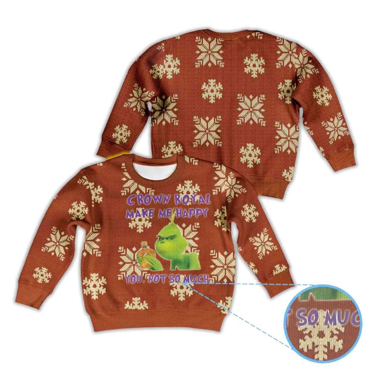 Infuse your holiday humor with the Grnch Crown Royal Make Me Happy You Not So Much Ugly Christmas Sweater. Perfect for those who love sarcastic wit, this sweater merges the Grnch’s iconic attitude with Crown Royal’s festive spirit—ideal for holiday parties, casual hangouts, or anyone tired of fake cheer but still craving real laughter.