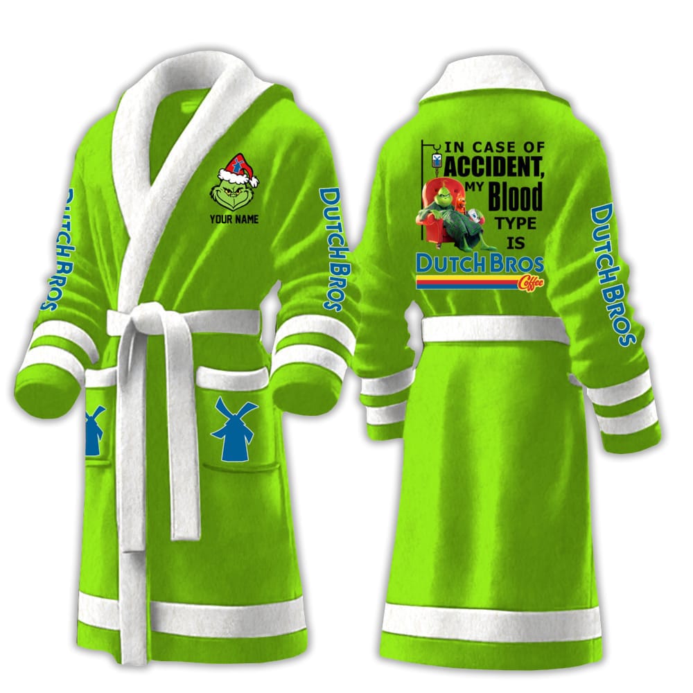 Stay warm and witty with the Grnch In Case Of Accident My Blood Type Is Dutch Bros Fleece Bathrobe. Inspired by the mischievous spirit of the Grinch and fueled by Dutch Bros coffee culture, this robe connects holiday humor, pop culture, and comfort in one bold statement.