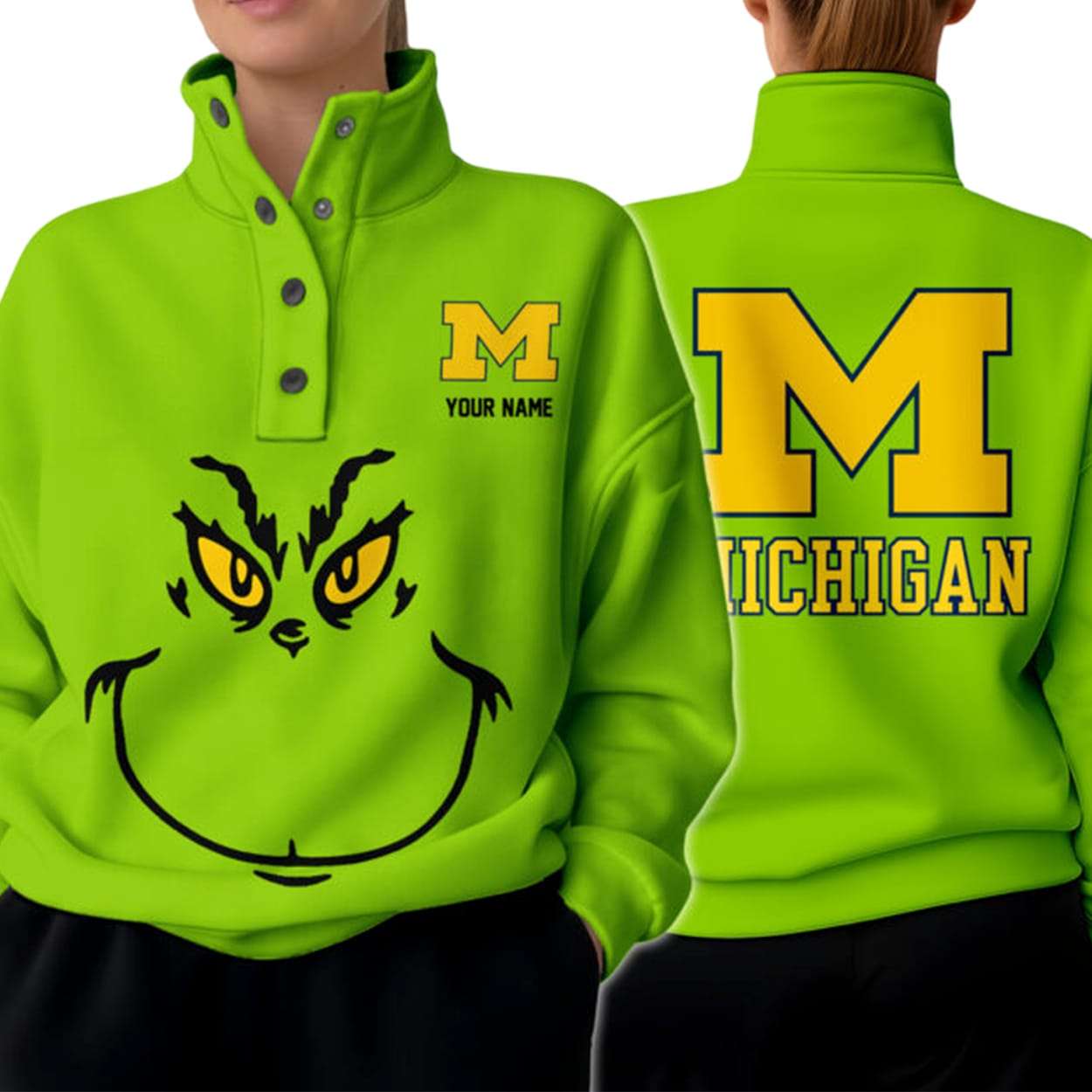 Infused with the Grinch’s notorious smirk and Michigan’s golden “M,” this sweater embodies duality—mischief meets honor. It’s a playful nod to individuality and the fearless energy of those who defy conformity, echoing both Dr. Seuss’s satire and collegiate determination.