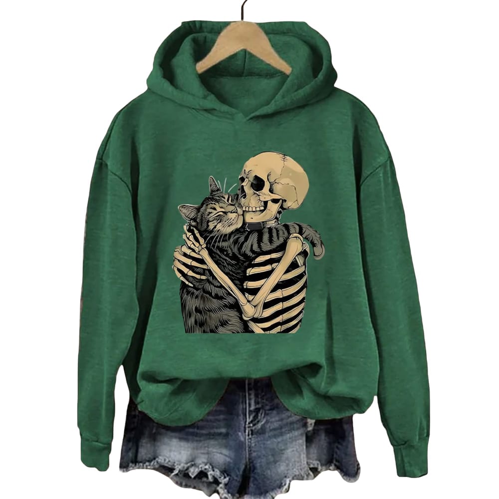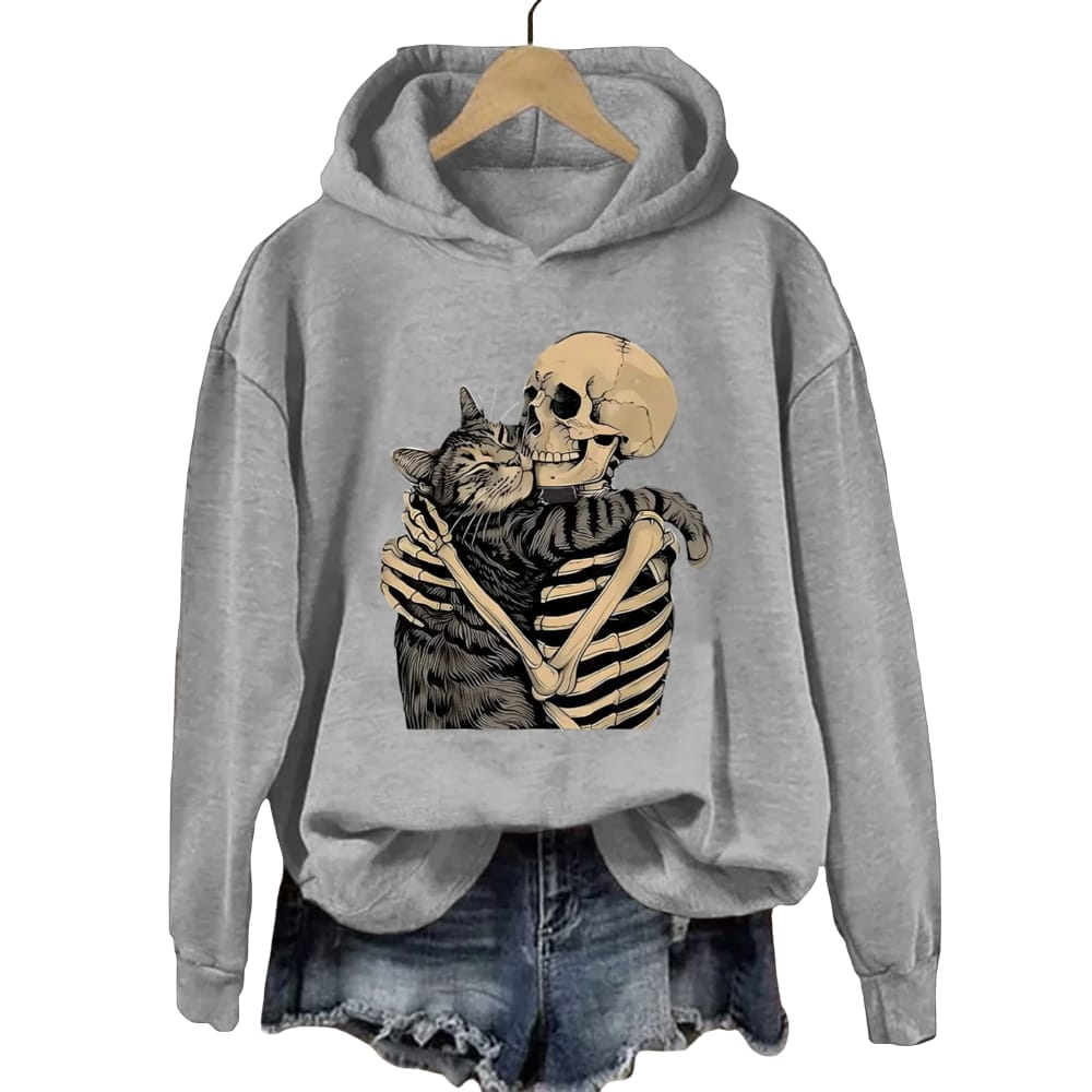 This Halloween Skeleton Cat Hoodie carries more than an image—it tells a tale. The skeleton, a universal emblem of mortality, holds a cat with unmistakable tenderness. The artwork becomes a dialogue between life and death, echoing the medieval tradition of memento mori where societies used skeletal imagery as reminders of human fragility. Here, however, the skeleton is not frightening but protective, shifting the narrative from fear of death to celebration of enduring connection.