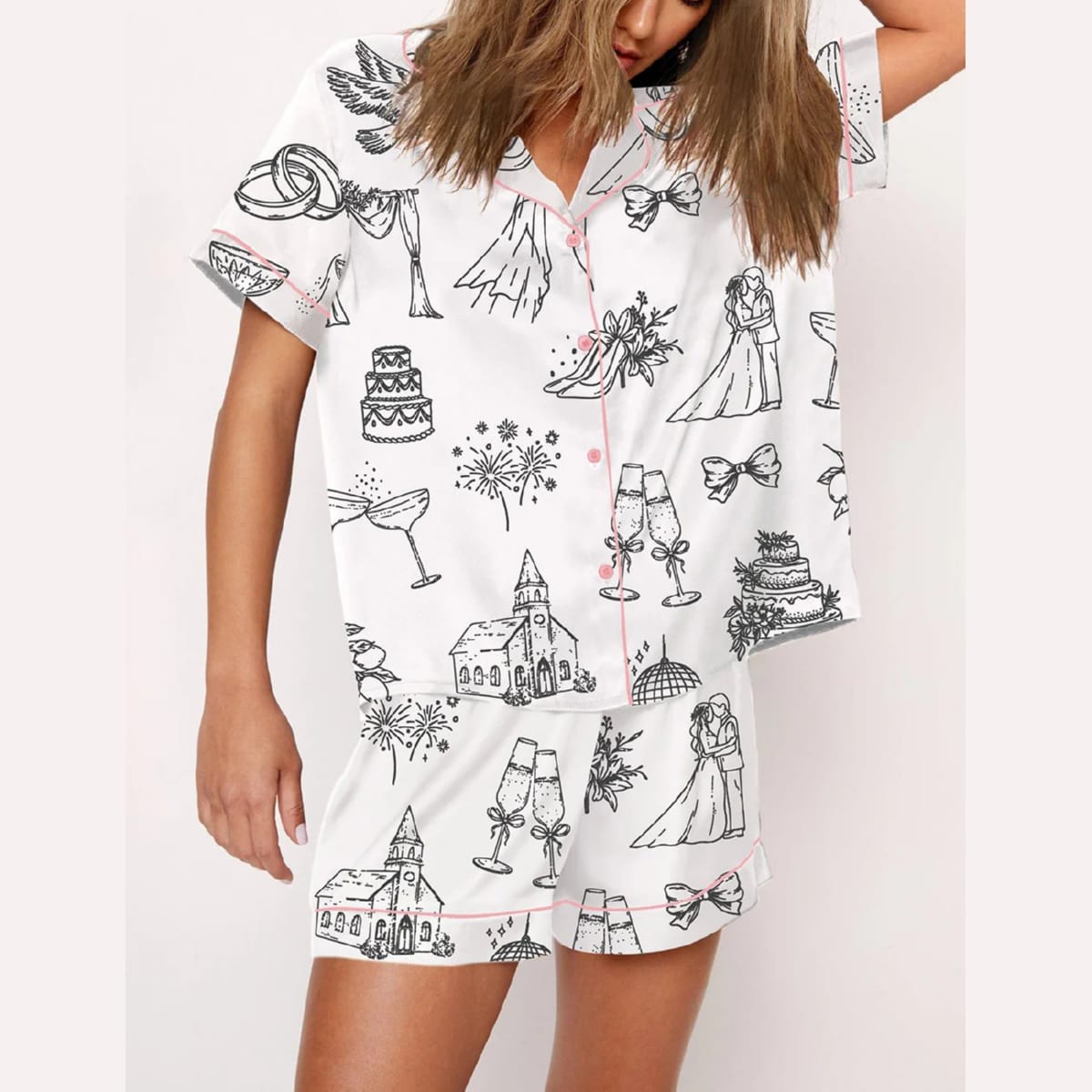 Each illustration on this pajama set traces the timeless rituals of marriage—from the bouquet toss to the champagne toast. These symbols echo centuries-old customs, like the Roman tradition of wedding rings and the medieval bridal procession through village streets.