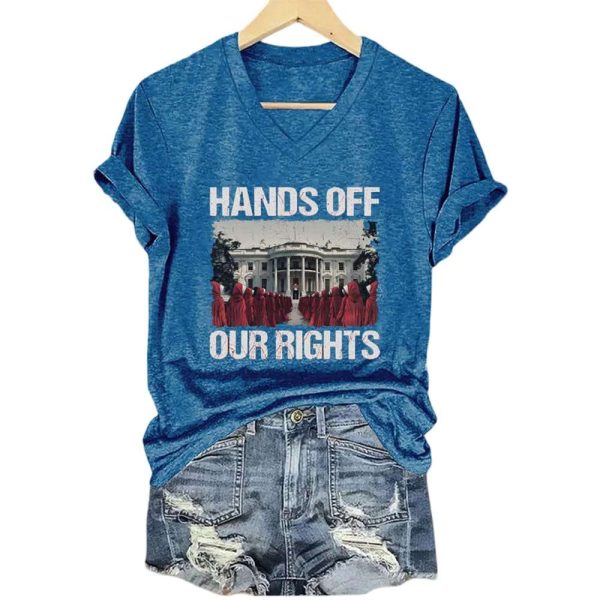 The imagery on this shirt is designed to evoke memories of movements like those depicted in The Handmaid’s Tale, a dystopian narrative where the rights of women and marginalized communities are stripped away. The phrase “Hands Off Our Rights” directly reflects the ongoing battles against oppressive policies, whether related to reproductive rights, voting rights, or other freedoms under threat. It’s not just a fashion statement; it’s a reminder of the fight for equality, justice, and freedom.