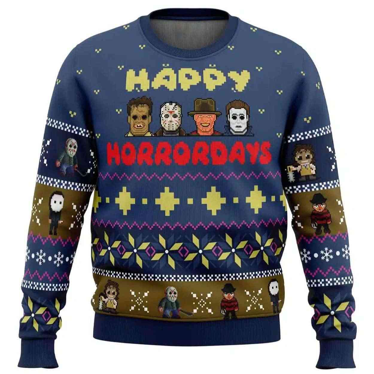 Unleash your inner scream queen with the Happy Horrordays Halloween Ugly Christmas Sweater. Featuring iconic horror legends like Freddy, Jason, and Frankenstein, this festive frightwear fuses holiday cheer with cinematic chills for fans who crave a darker twist on tradition.