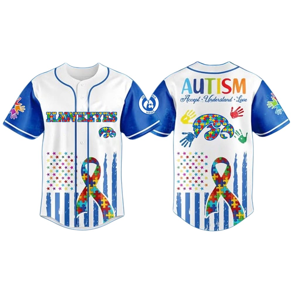 Support Autism Awareness with the Hawkeyes Autism Awareness Month Baseball Jersey 2025, designed for the 2025 Awareness Month. Featuring vibrant puzzle pieces and handprints, this jersey symbolizes the need for acceptance, understanding, and love. Wear it proudly to help raise awareness!