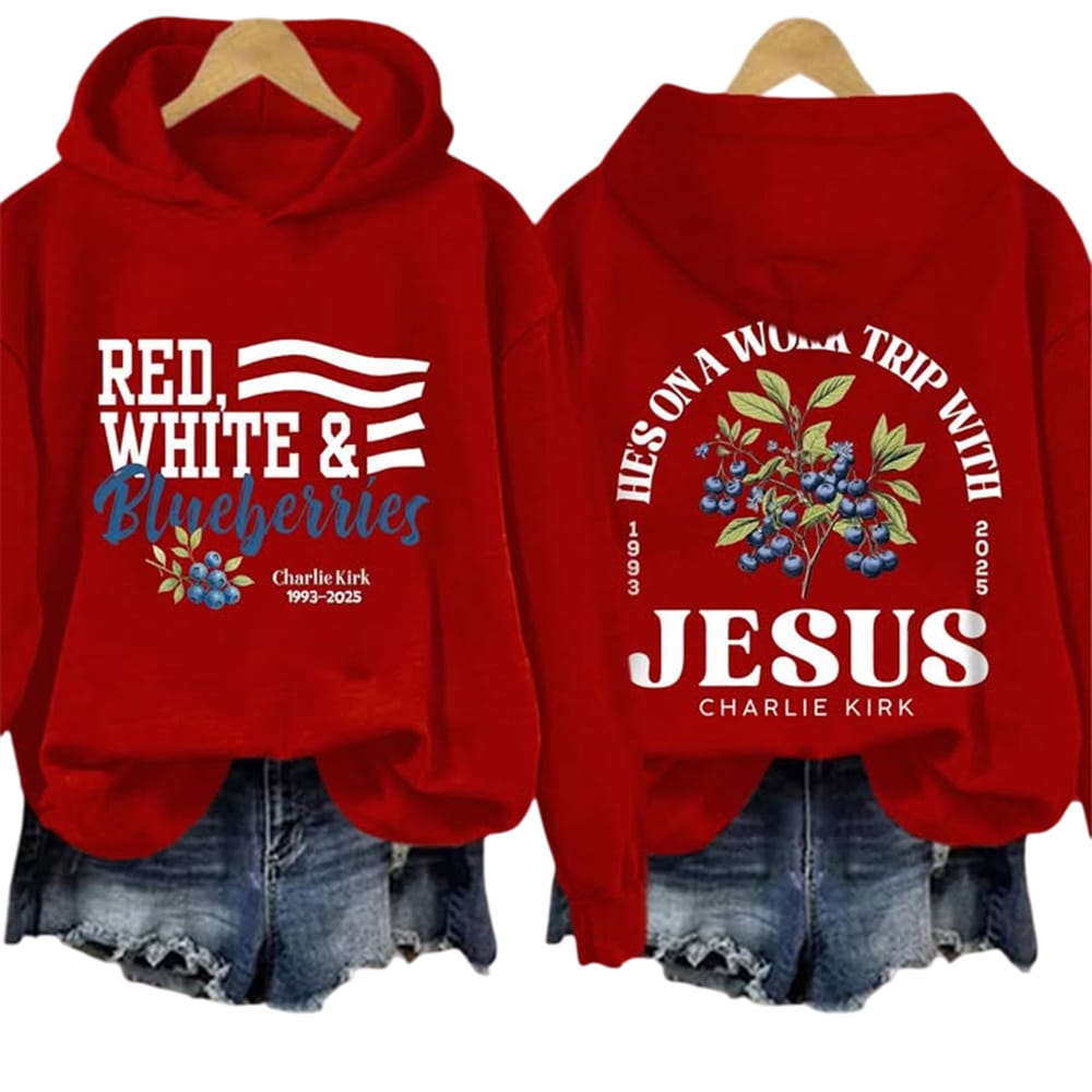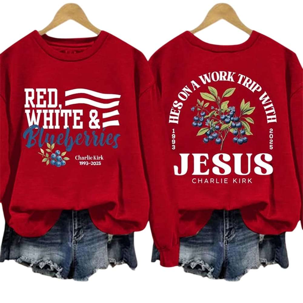 This He’s On A Work Trip With Jesus Charlie Kirk Red White and Blueberries Sweatshirt weaves faith, identity, and legacy into bold imagery. Following the tragic assassination of Charlie Kirk at Utah Valley University, it stands as a statement of conviction, shared mourning, and cultural memory for supporters and observers.