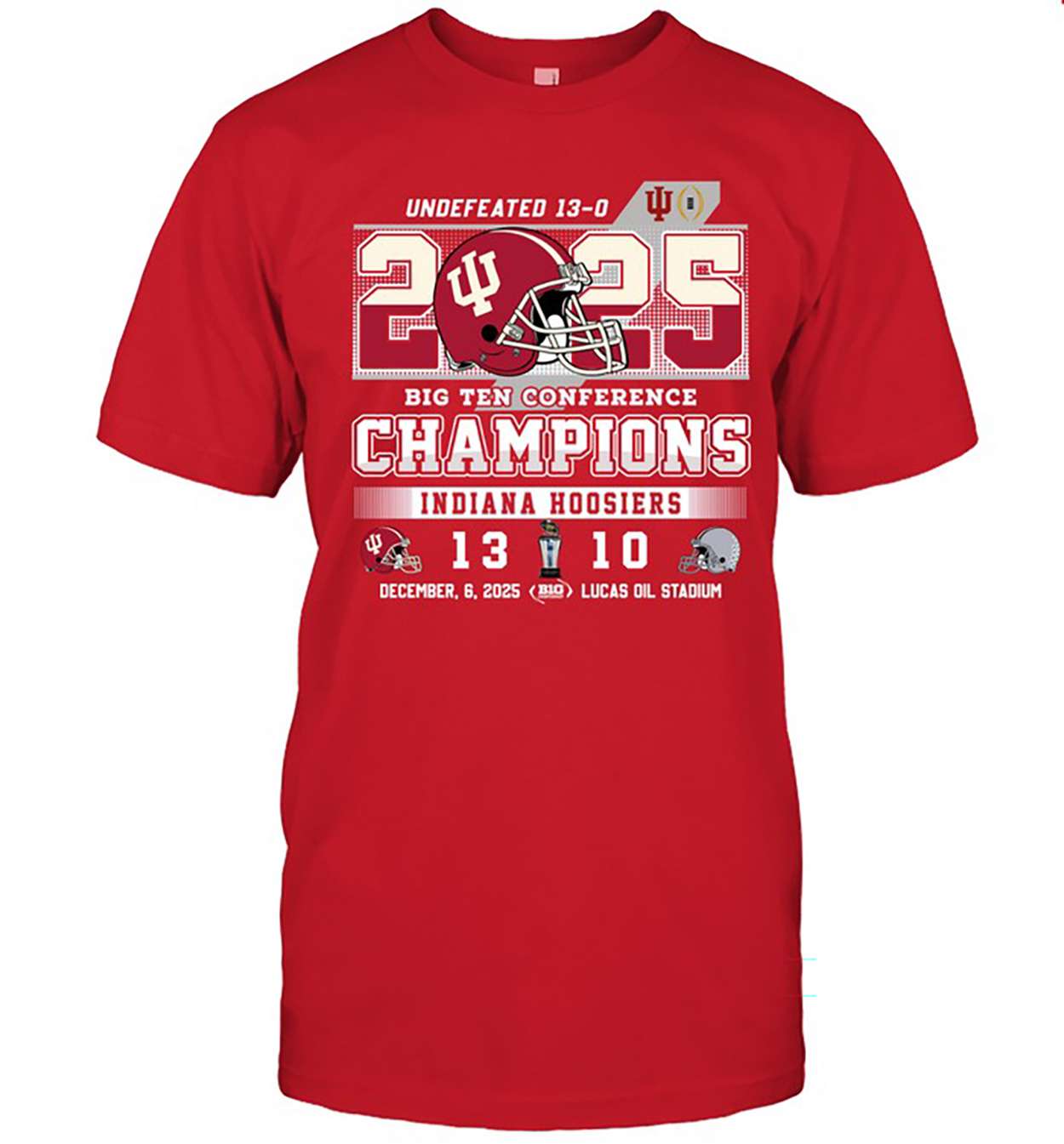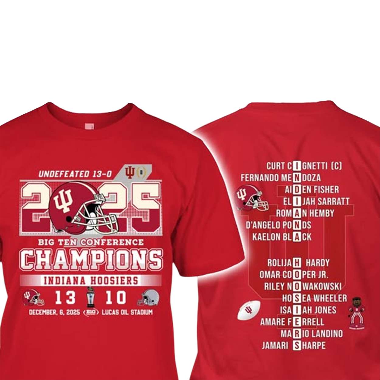 Show your pride for the Indiana Hoosiers’ flawless 13-0 season with this Hoosiers Undefeated 13-0 Big Ten Champions Two-Sided Shirt. Featuring championship details, player names, and the final score from Lucas Oil Stadium, it’s a bold tribute to unity, grit, and historic achievement in college football.