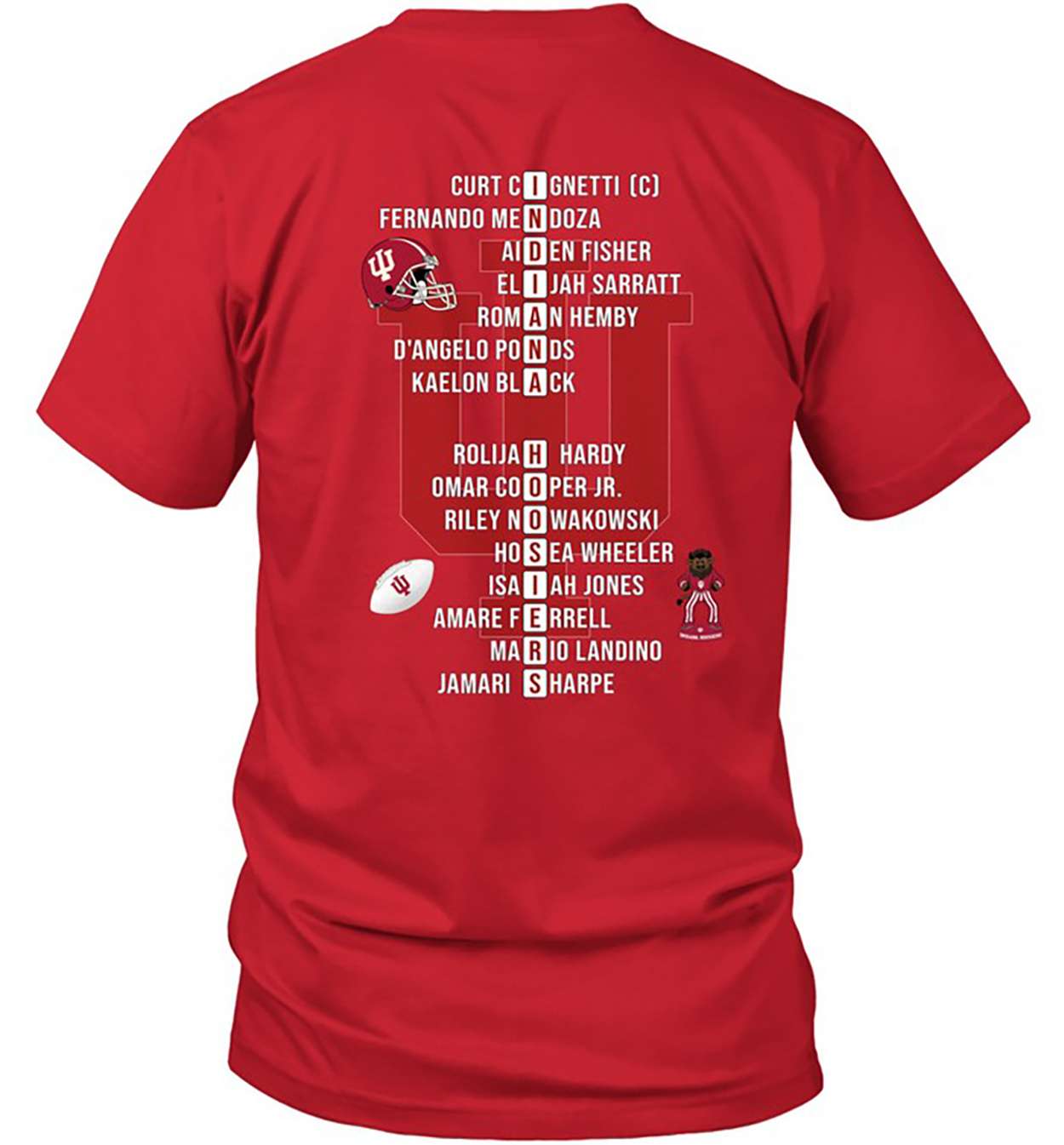 The back lists key players and staff, with highlighted letters spelling “CHAMPIONS.” Names like Fernando Mendoza and Elijah Sarratt reflect the team’s depth, while Curt Coingetti’s leadership anchored a squad that defied expectations and reshaped Indiana’s football legacy.