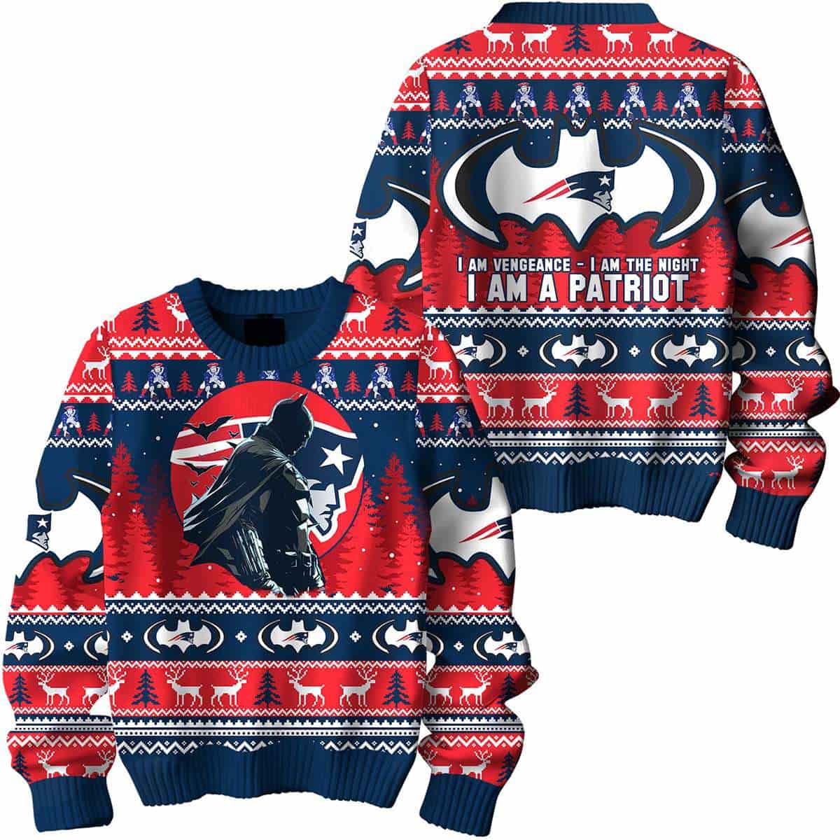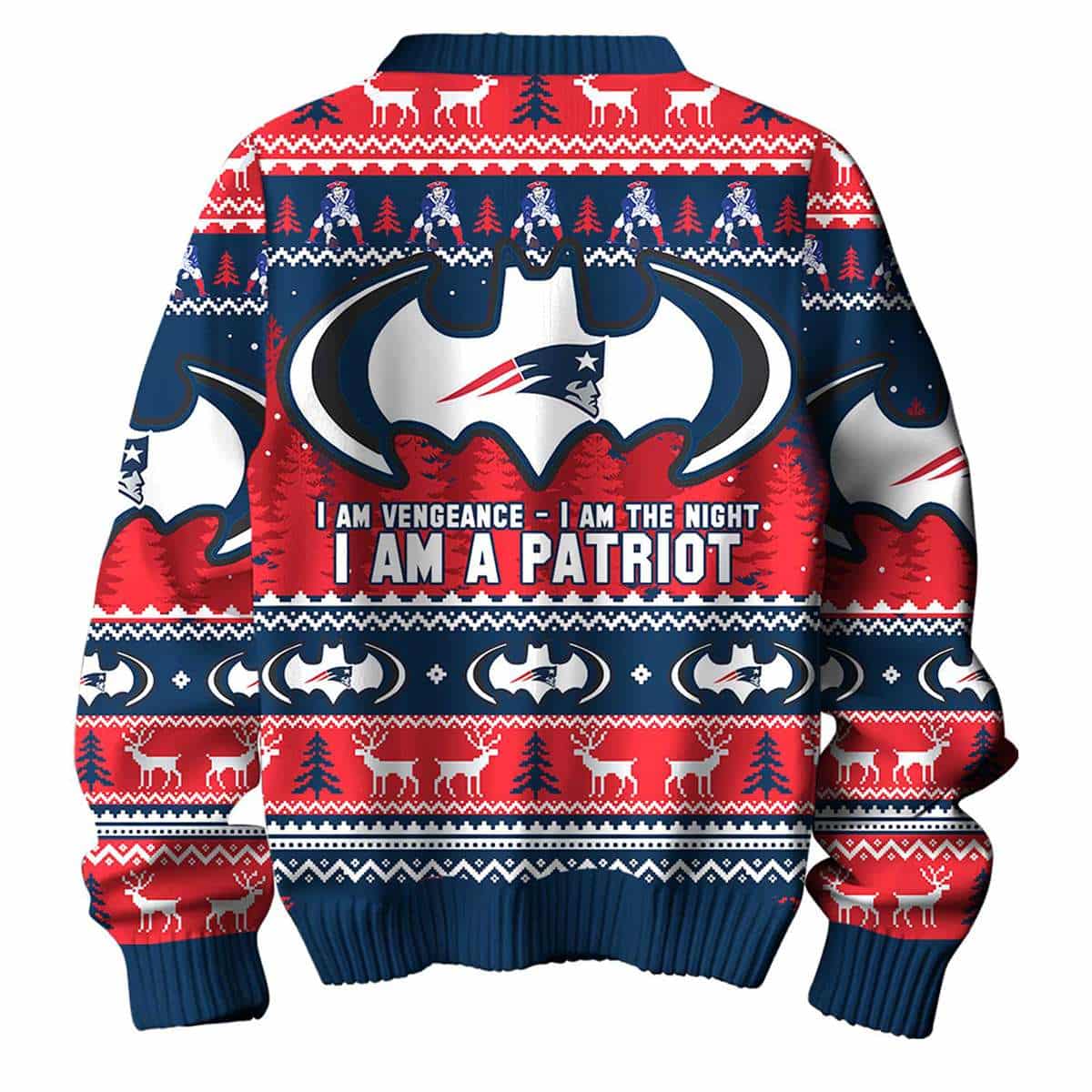 Channel Gotham grit and gridiron pride with the I Am Vengeance I Am The Night I Am A Patriot Ugly Christmas Sweater. Featuring Batman’s silhouette and the Patriots logo, this bold design fuses comic book legacy with football devotion in festive flair.