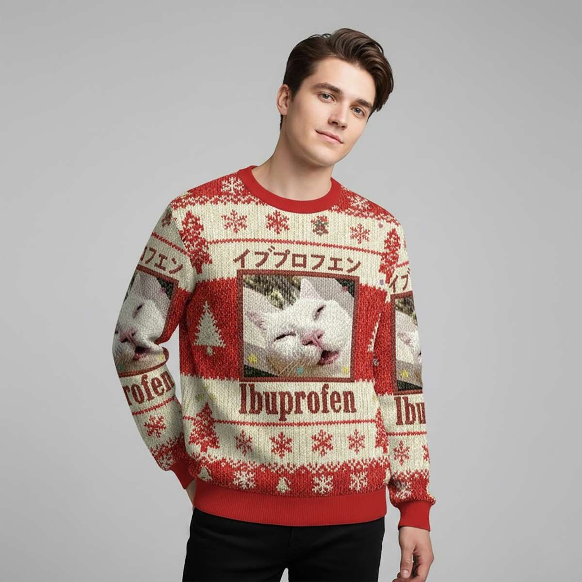 Turn heads this season with the Ibuprofen Meme Cat Christmas Ugly Sweater. Featuring a squinting feline and Japanese text, it blends internet humor with holiday charm. A perfect gift for meme lovers and those who appreciate quirky, socially aware fashion.