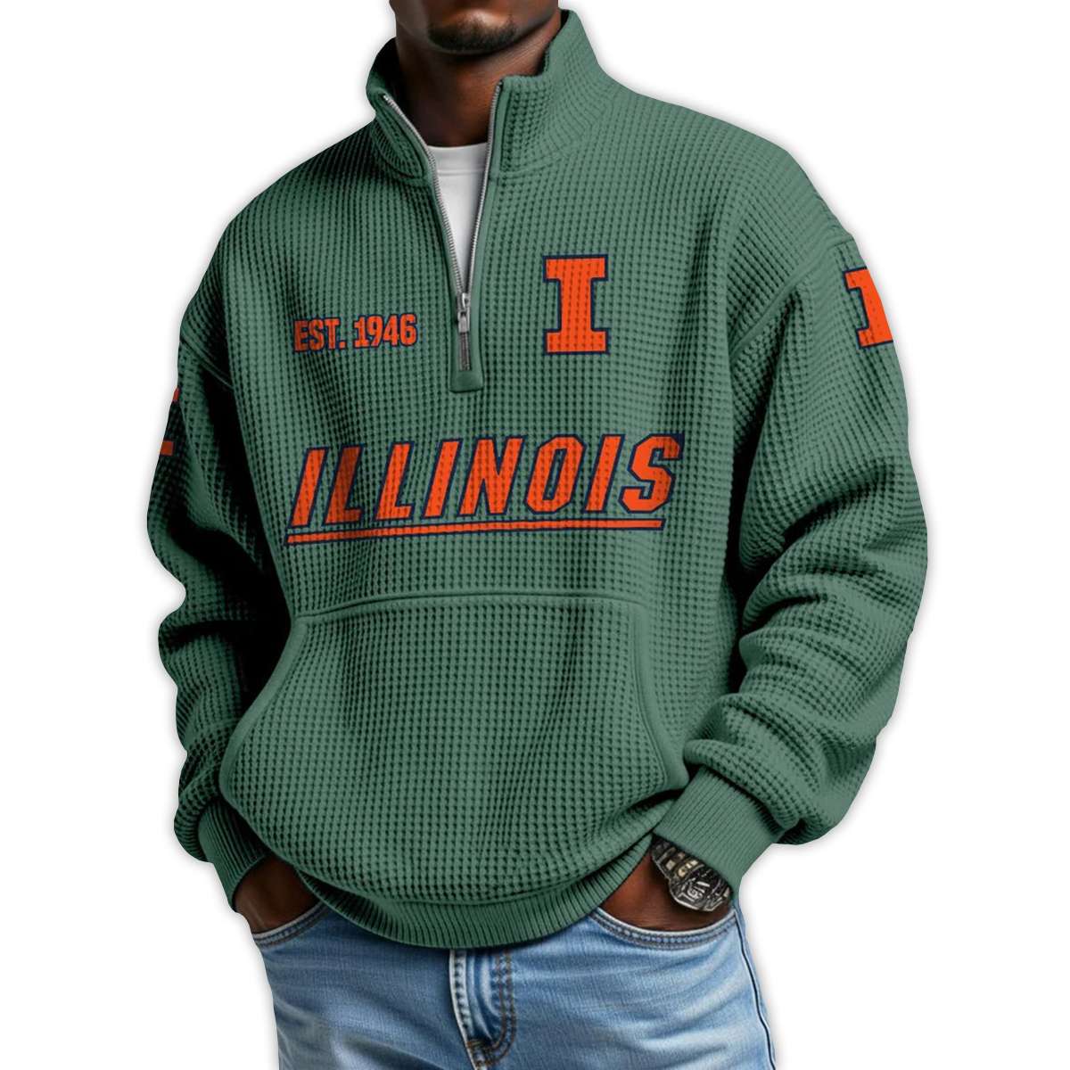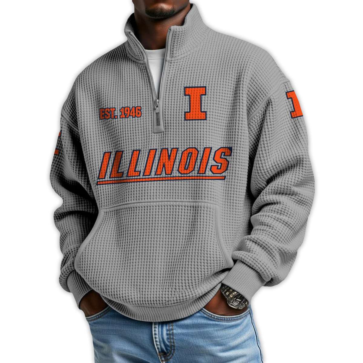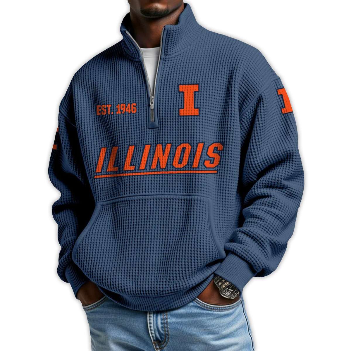 Show your pride with the Illinois Football Est 1946 Waffle Stand Collar Half Zip Sweatshirt. Featuring bold graphics and historic references, this pullover connects fans to the Fighting Illini’s post-war rise, legendary athletes, and the enduring spirit of Big Ten competition.