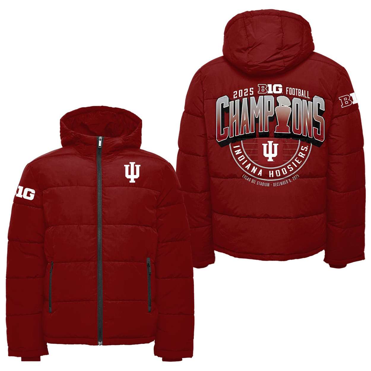 Show your pride in Indiana’s historic 2025 Big Ten football triumph with this Indiana Football 2025 Big Ten Champions Down Jacket. Featuring championship graphics and nods to Lucas Oil Stadium, it honors the Hoosiers’ grit, leadership, and unforgettable December 6th victory in Indianapolis.