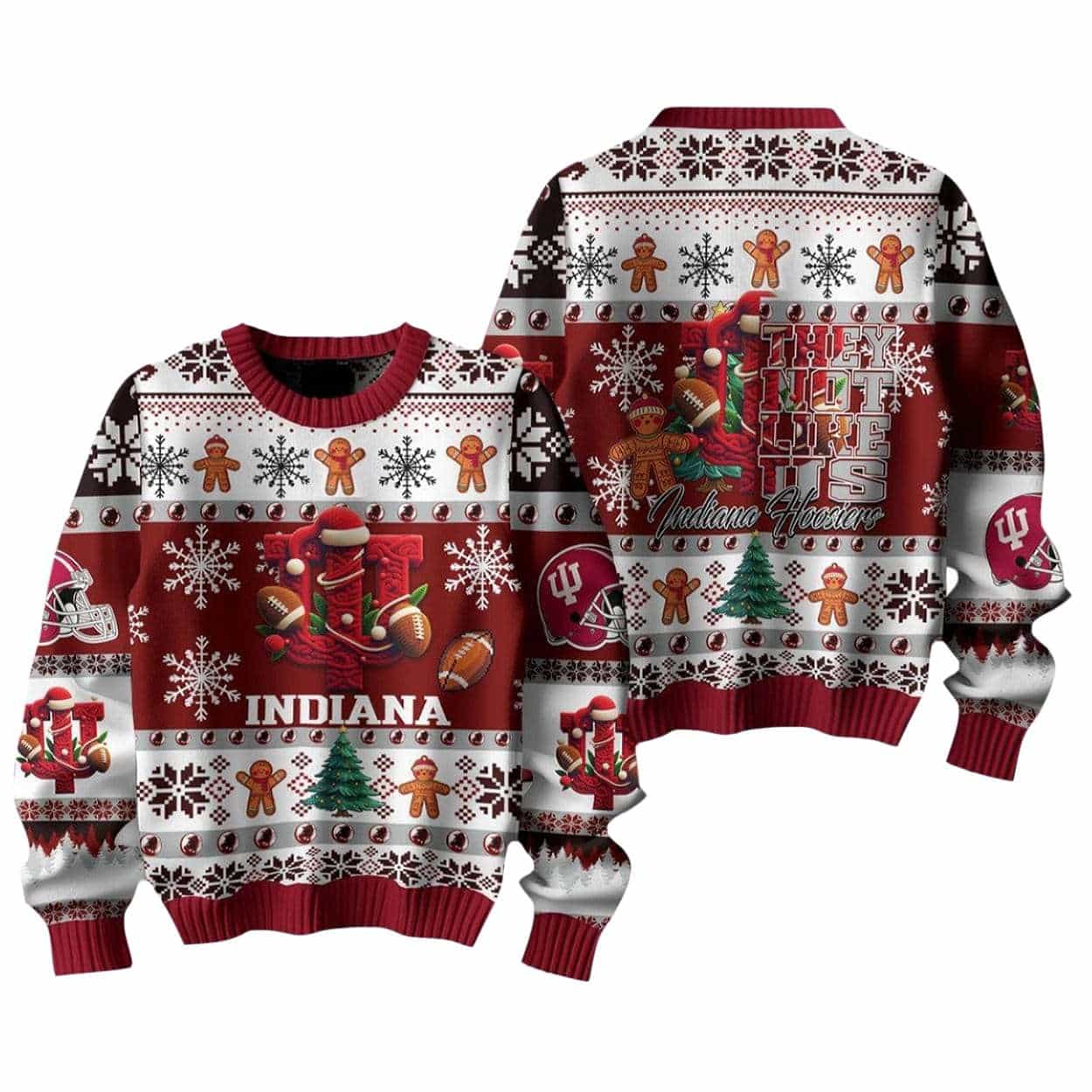 Snowflakes, gingerbread men, and ornaments add playful contrast to the sweater’s fierce tone. It’s a wearable tribute to Hoosier culture—where loyalty runs deep, and every stitch tells a story of pride, perseverance, and community.