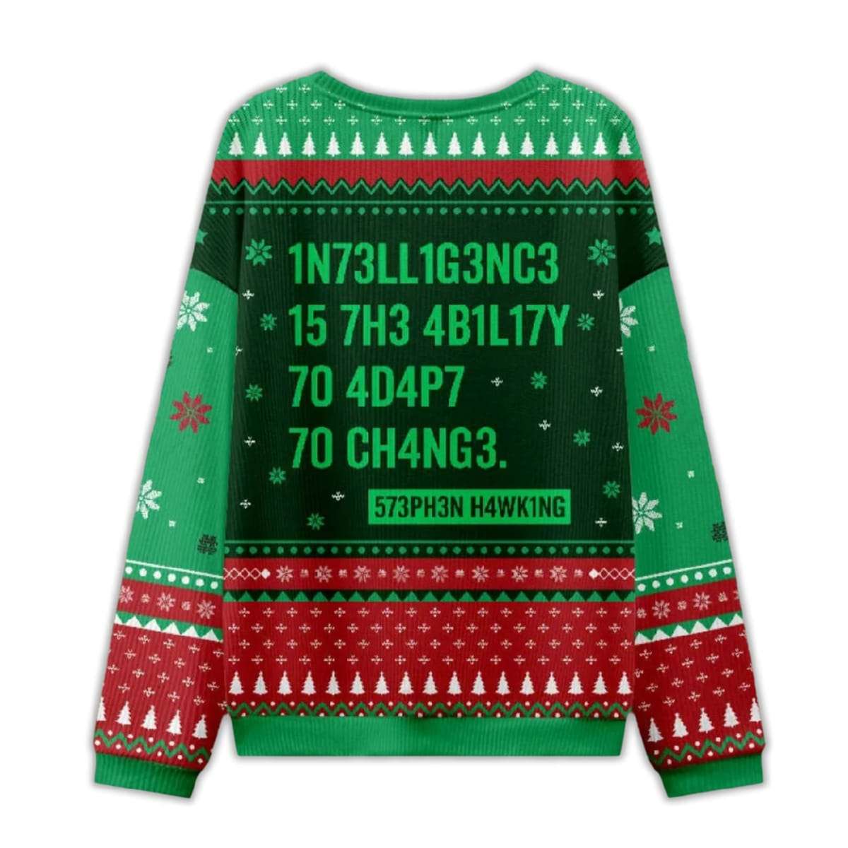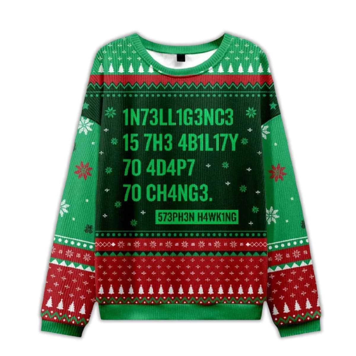 Show off your intellect and seasonal spirit with the Intelligence Stephen Hawking Science Ugly Christmas Sweater. Featuring a leetspeak quote from the legendary physicist, this bold design merges holiday humor with a tribute to human adaptability and scientific legacy.