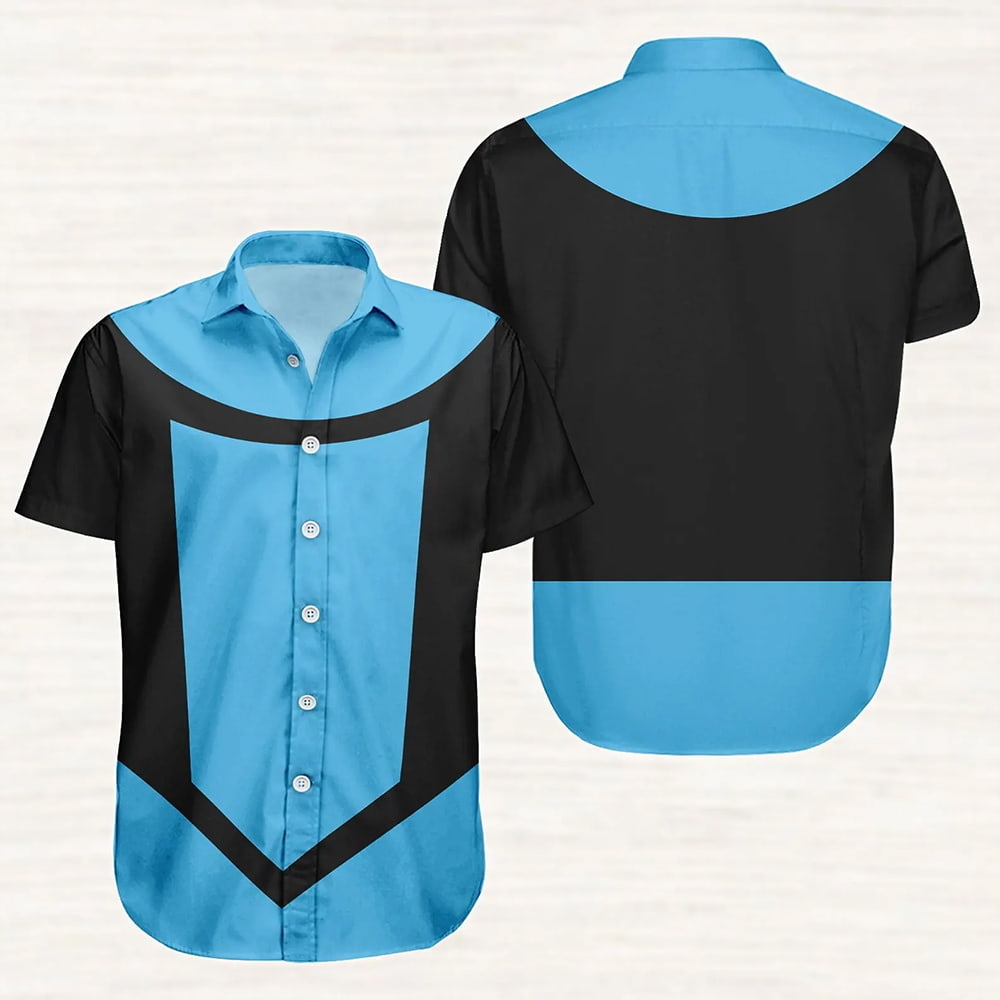 Step into the iconic suit of Mark Grayson with this Invincible Mark Grayson Cosplay Costume Button Shirt and shorts set. This two-piece outfit is designed for both comfort and authenticity, making it the perfect choice for any fan looking for an easy, yet eye-catching costume. The button-down shirt features the unmistakable color-block pattern of Invincible’s uniform: a broad, light blue front panel with a black stripe that runs from the top to the bottom. This is complemented by a solid black back and sleeves, and the set is finished with matching light blue shorts.