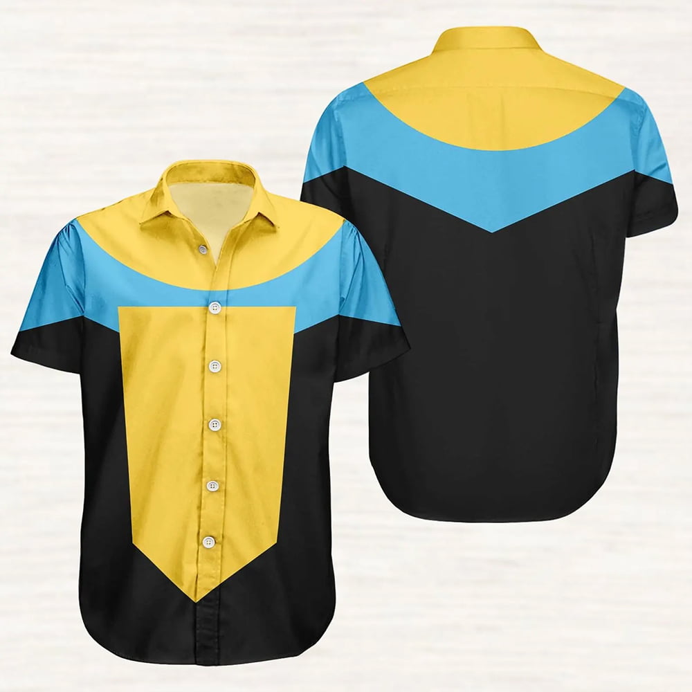 Step into the iconic suit of Mark Grayson with this Invincible Mark Grayson Costume Halloween Button Shirt and shorts set. This two-piece outfit is designed for comfort and style, making it the perfect choice for any fan looking for an easy, yet authentic costume. The button-down shirt features the unmistakable color-block pattern of Invincible’s uniform: a broad, yellow front panel, a curving blue shoulder design, and black sides. Paired with the solid black shorts, this set provides a complete and comfortable outfit.