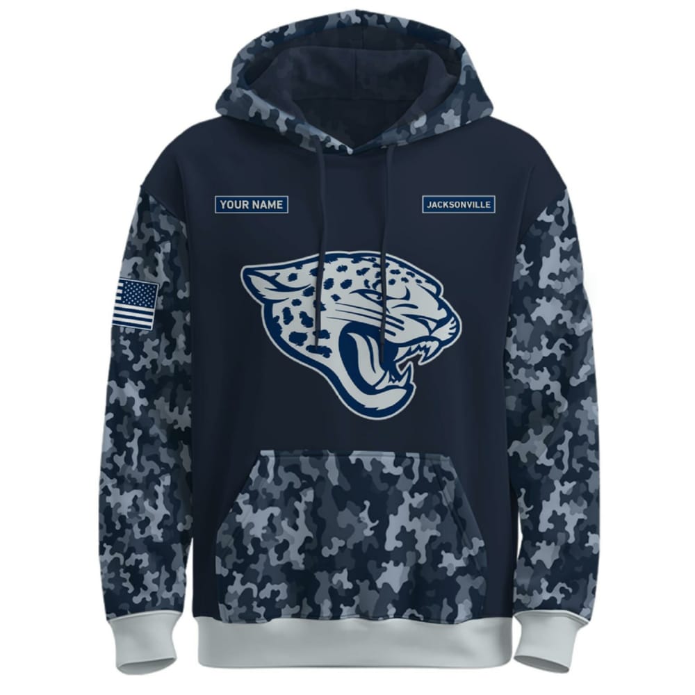 The front features the striking Jaguars logo, a symbol of strength and tenacity, positioned alongside personalized elements such as your name, which enhances the sense of individuality and connection. This hoodie’s design is not just a fashion statement but a nod to the values of resilience, honor, and teamwork—qualities shared by both the U.S. Navy and the Jaguars.