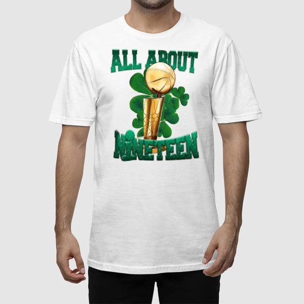 The phrase “All About Nineteen” boldly displayed on the shirt reflects the team’s championship mindset, their focus on securing banner number 19, and the dedication required to stay at the top of the basketball. This phrase resonates with longtime Celtics fans and newcomers alike, celebrating both past triumphs and future victories. Whether you’ve watched the historic rivalry against the Lakers, the incredible 2022 Finals run, or Tatum’s record-setting performances, this shirt represents your part in the team’s championship journey.