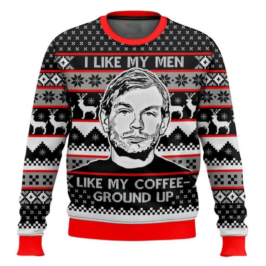 Embrace a bold and edgy look with the Jeffrey Dahmer I Like My Men Like My Coffee-Ground Up Ugly Christmas Sweater. This sweater features a unique design that nods to notorious historical figures and dark humor. Perfect for those with a dark sense of style and humor.