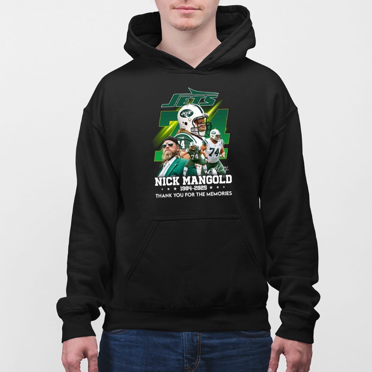 Pay tribute to football legend Nick Mangold with this striking Jets #74 shirt. Featuring powerful visuals and dates marking his impact from 1984–2025, this design connects fans to football history and the enduring spirit of New York sports culture.
