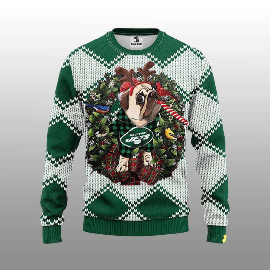 Jets Pub Dog Ugly Christmas Sweater – Festive Pug with New York Jets Spirit