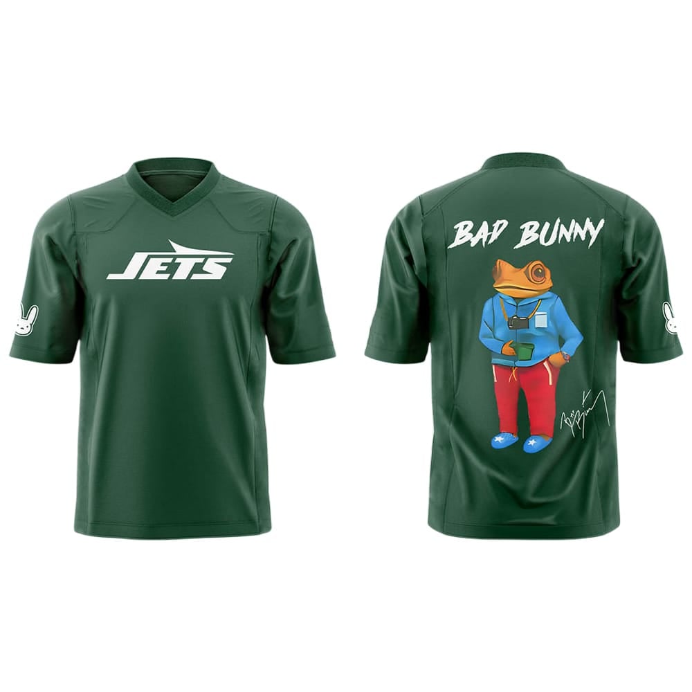 This limited Jets x Bunny Football Jersey merges gridiron passion with the artistry of Bad Bunny, one of music’s most influential voices. The front honors the Jets’ legacy, while the back showcases a quirky amphibian figure—a nod to playful rebellion and street creativity.