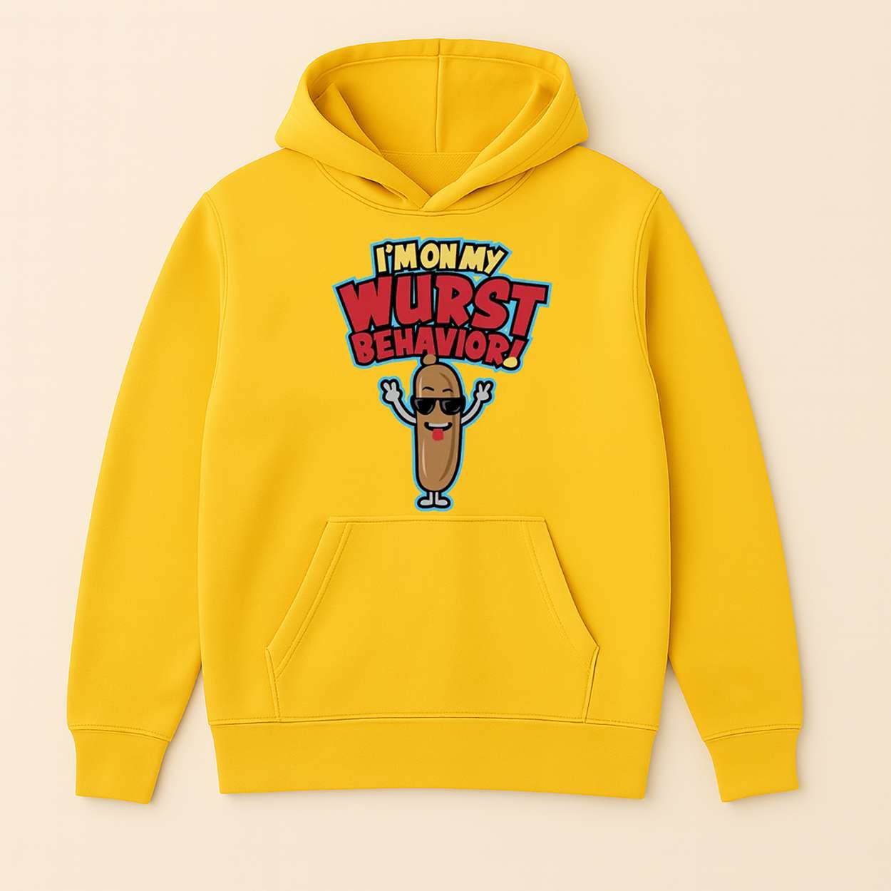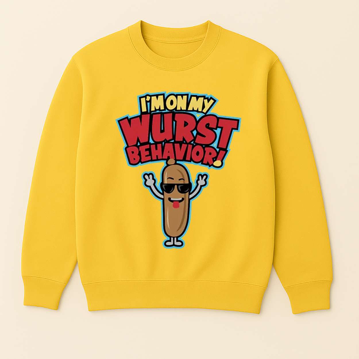 This sweatshirt stars a cartoon sausage with sunglasses and sass, echoing Kevin Jonas’s lighthearted persona and the Jonas Brothers’ flair for blending humor with heart. The phrase “Wurst Behavior” riffs on pop slang while nodding to German culinary culture.