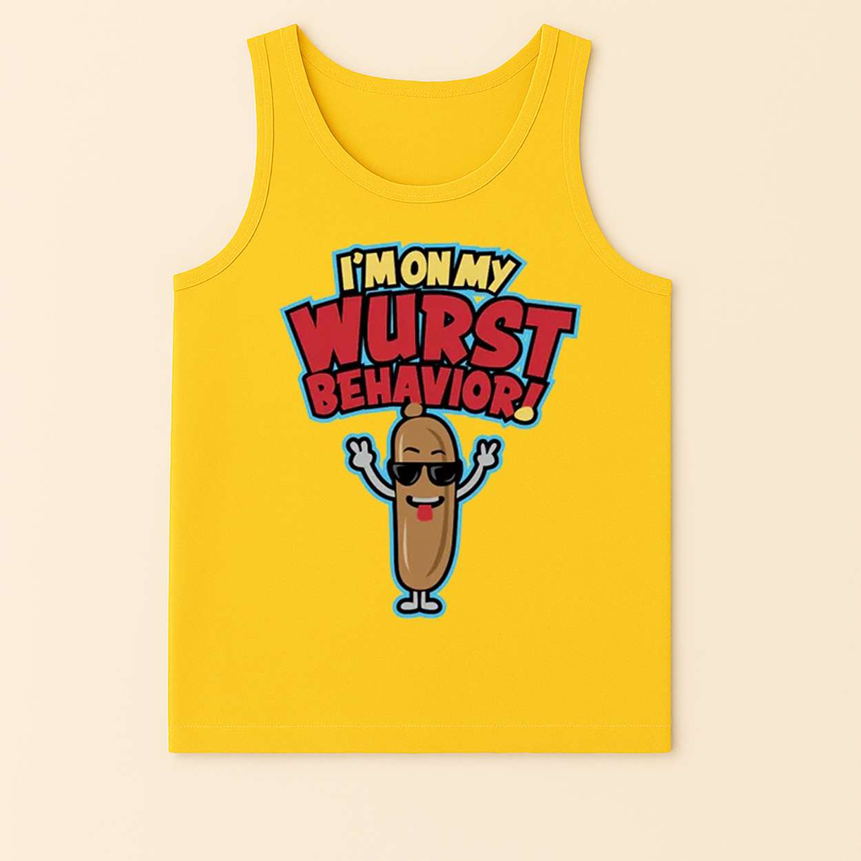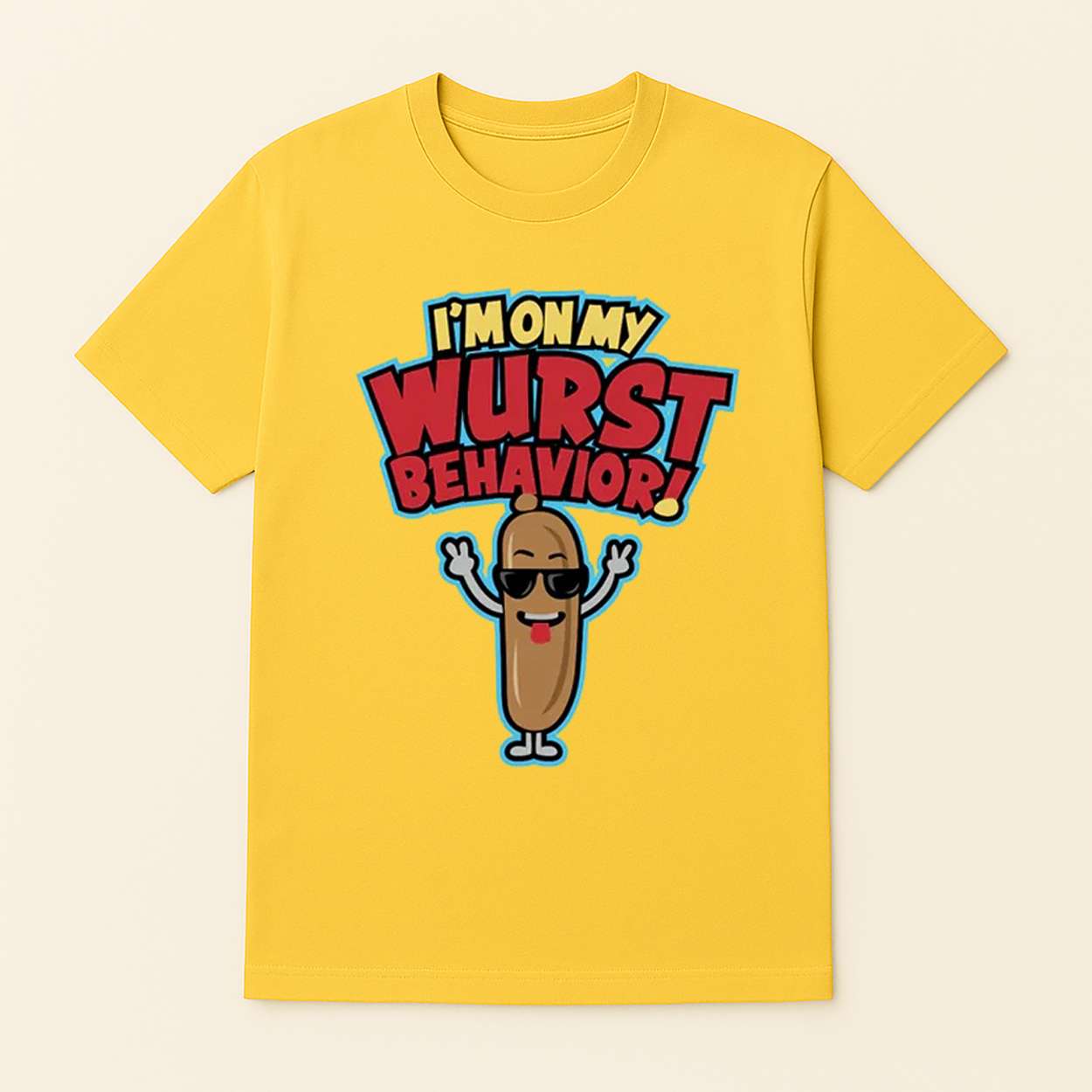 The design playfully critiques celebrity image-making, turning a sausage into a symbol of exaggerated confidence. It’s a wink to the performative nature of fame, where even the most mundane can be elevated to icon status with enough swagger.