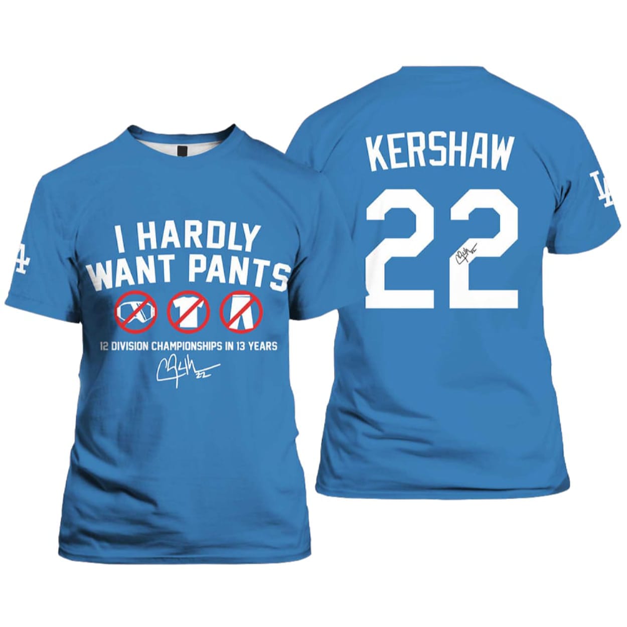 This shirt honors Kike Hernández’s infectious energy and Clayton Kershaw’s unmatched legacy. The witty “I Hardly Want Pants” design reflects Kike’s playful spirit—a nod to locker room humor that became part of the Dodgers’ identity during their dominant run.