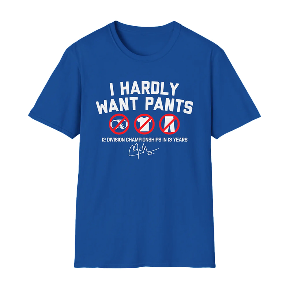 The front reads “I HARDLY WANT PANTS” in bold block letters above three red icons banning jeans, slacks, and shorts. A stylized Dodgers-style signature sits just below the graphic. Perfect for game-day excitement, watch parties, or day-to-day wear, this tee captures the unfiltered joy of a championship locker-room.
