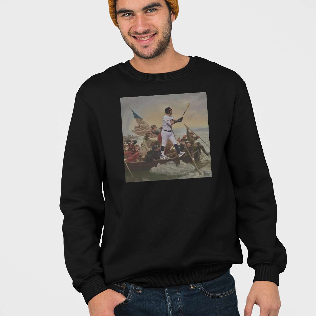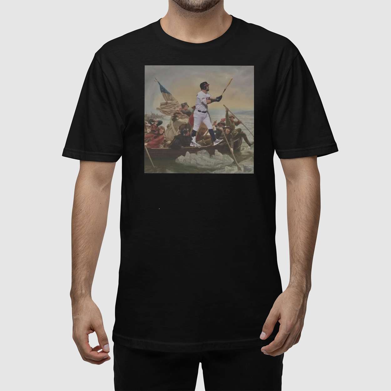 This shirt reimagines Emanuel Leutze’s legendary “Washington Crossing the Delaware,” blending artistry with athletic passion. Kyle Schwarber stands tall among historic figures, embodying courage and determination. The design bridges centuries, linking revolutionary grit with the fearless energy of contemporary sports heroes.