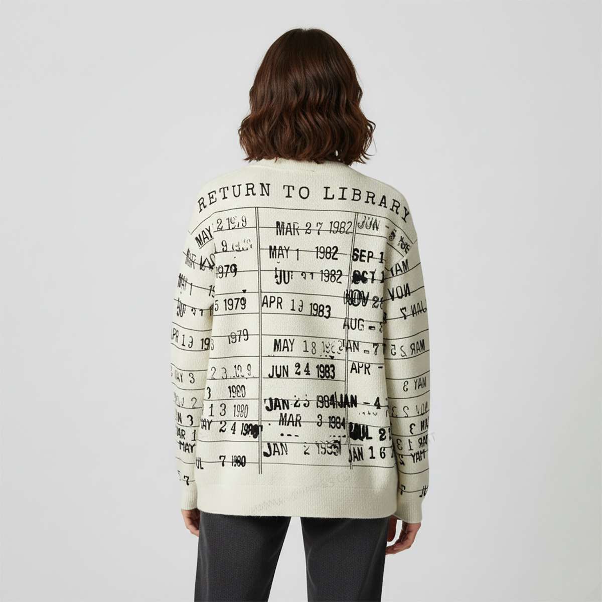 Each sweater is a tapestry of time, stitched with months and years that echo the rhythm of library life. From “JAN” to “DEC,” the design mimics the classic date stamps once pressed into borrowed books—a nod to analog memory and quiet rebellion.