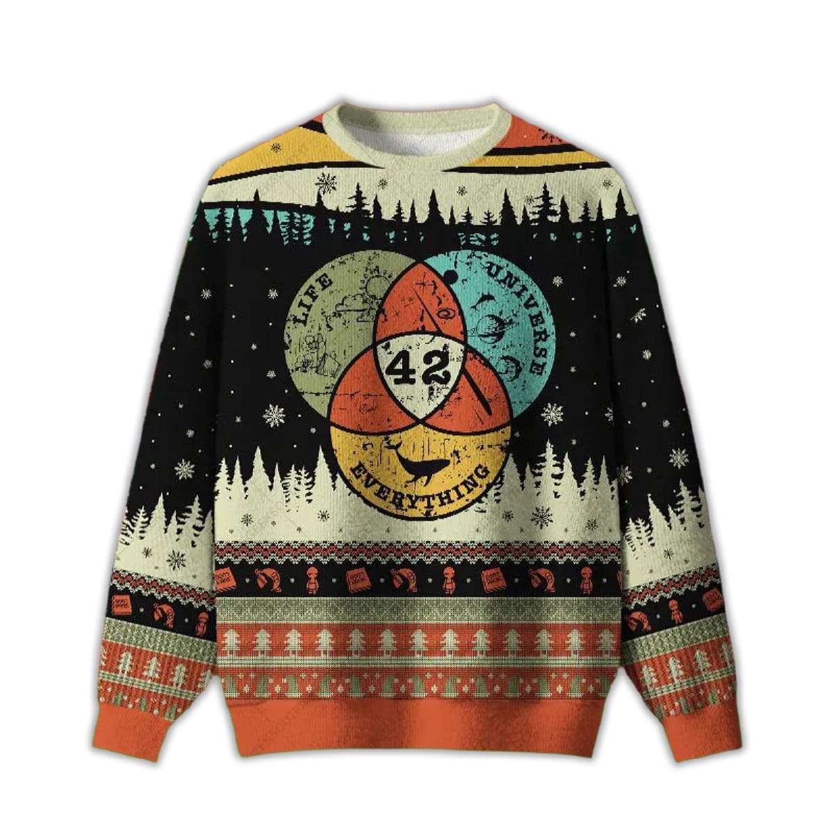 Life Universe & Everything Nerdy Graphic Ugly Christmas Sweater – A Galactic Nod to Nerd Culture