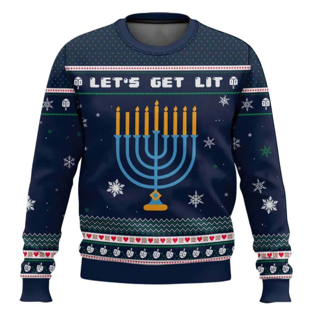 The Lit Christmukkah Funny Ugly Christmas Sweater blends Hanukkah and Christmas joy in a bold, humorous design. Featuring a glowing menorah and playful “Let’s Get Lit” phrase, this sweater connects tradition and modern humor. Perfect for those celebrating unity, laughter, and the light that brightens every December gathering.