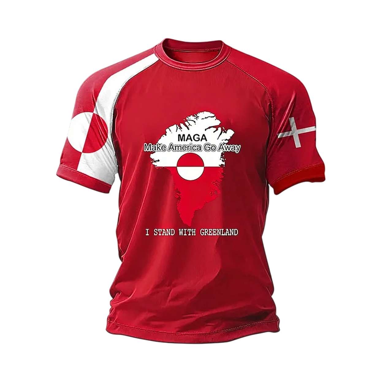 This shirt features a striking red silhouette of Greenland, layered with its national flag—a visual nod to the island’s enduring identity. The phrase “Make America Go Away” reclaims a familiar slogan, flipping it into a call for autonomy and resistance.