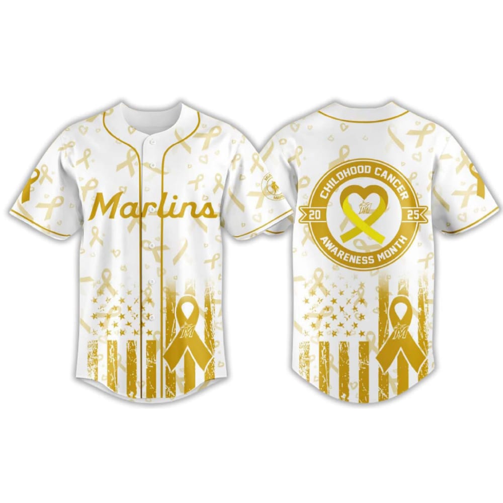 Show your support with the Marlins Childhood Cancer Awareness Month 2025 Jersey. Designed in gold with symbolic ribbons and a powerful emblem, this jersey reflects the fight against childhood cancer. Inspired by the resilience of young warriors and the history of sports teams standing with communities, it unites fans in a cause that goes beyond the game. Own a piece of purpose, where baseball meets compassion and history.